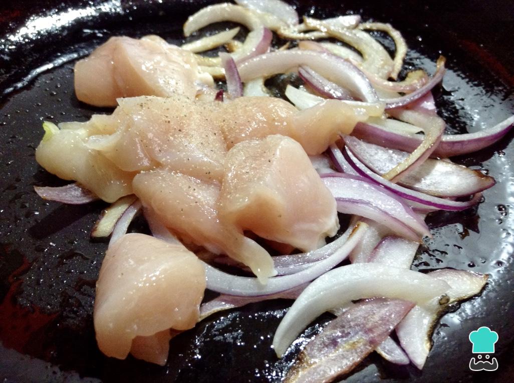 Añade la pechuga de pollo cortada en cuadros medianos con un poco de pimienta al gusto. Saltea durante algunos minutos y retira los ingredientes del wok.