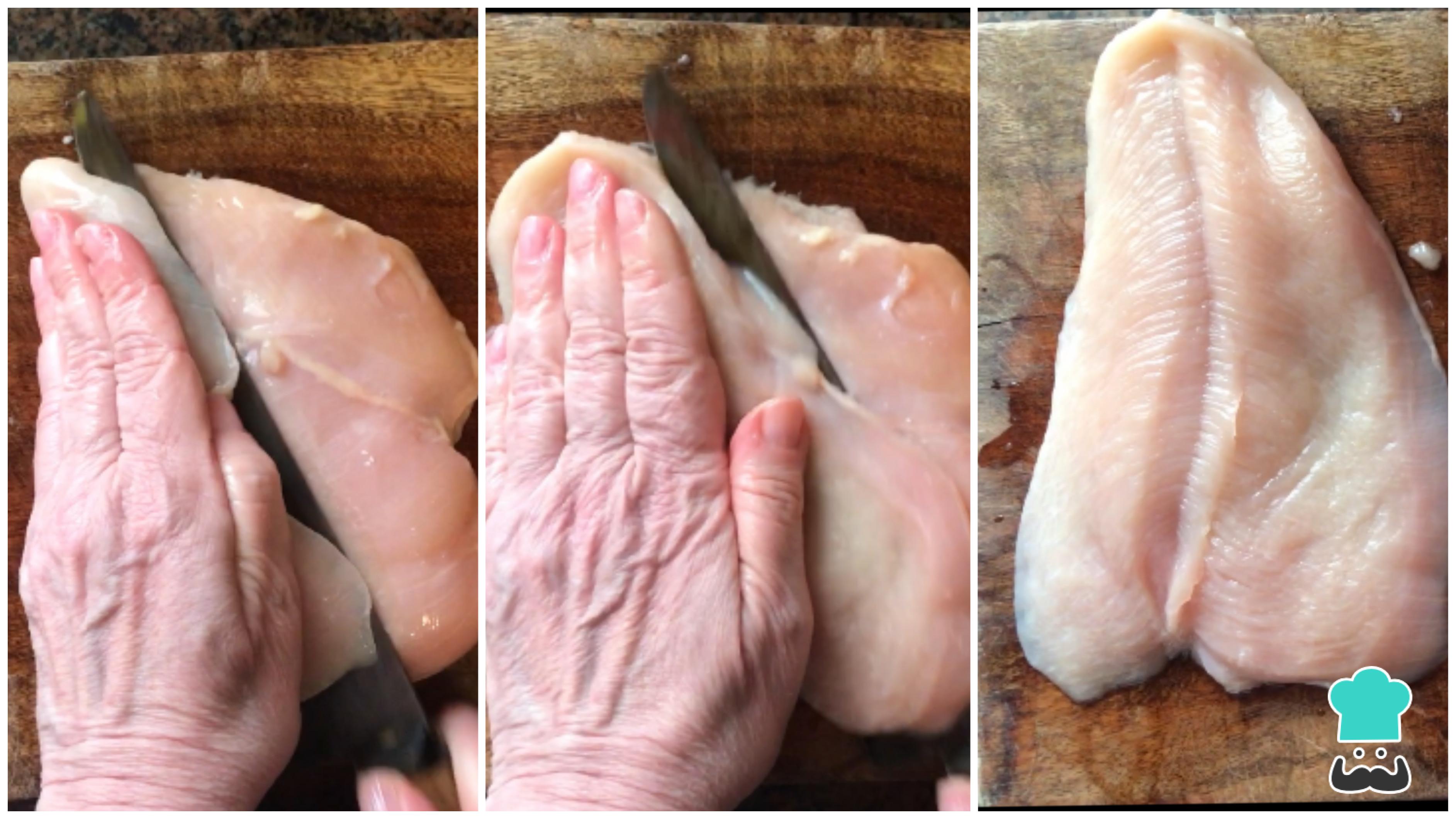 Para hacer esta receta de suprema a la suiza, primero debes separar los churrasquitos de pollo. Para ello, pon tu mano sobre la suprema y haz un corte en el primer medio centímetro de ancho, sin cortar completamente. A continuación, haz un segundo corte, esta vez llegando hasta el final. Ábrelo y tendrás un churrasquito tipo mariposa. Repite este procedimiento 2 veces más para tener 3 churrasquitos de pollo.