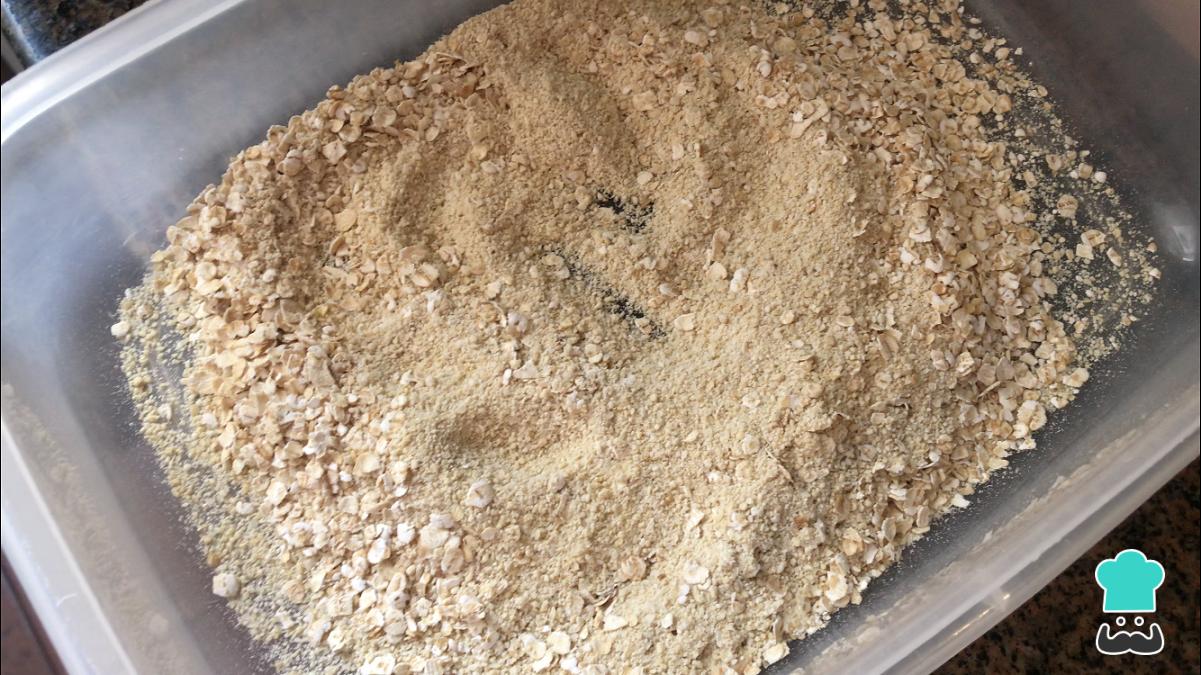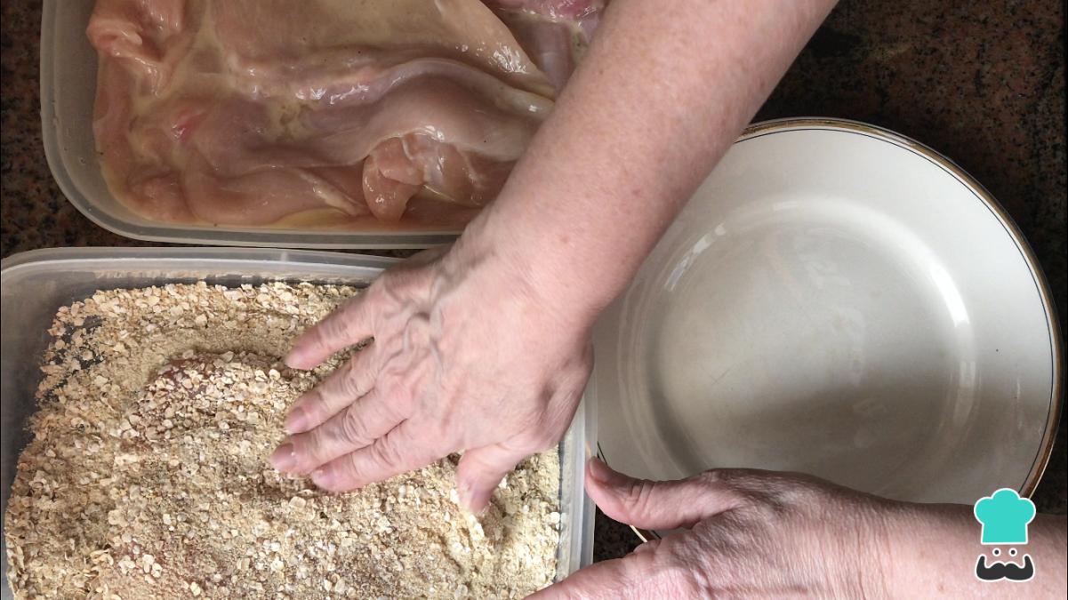 Procede a empanar tus churrasquitos de pollo. Para ello, pásalos por el huevo primero y por el pan rallado con la avena después. Ejerce algo de presión sobre la milanesa para que el pan rallado se pegue bien. Cocínalas en el horno a 200 ºC sobre una asadera con 1 cucharadita de aceite desparramada con aceite o aceite en aerosol.