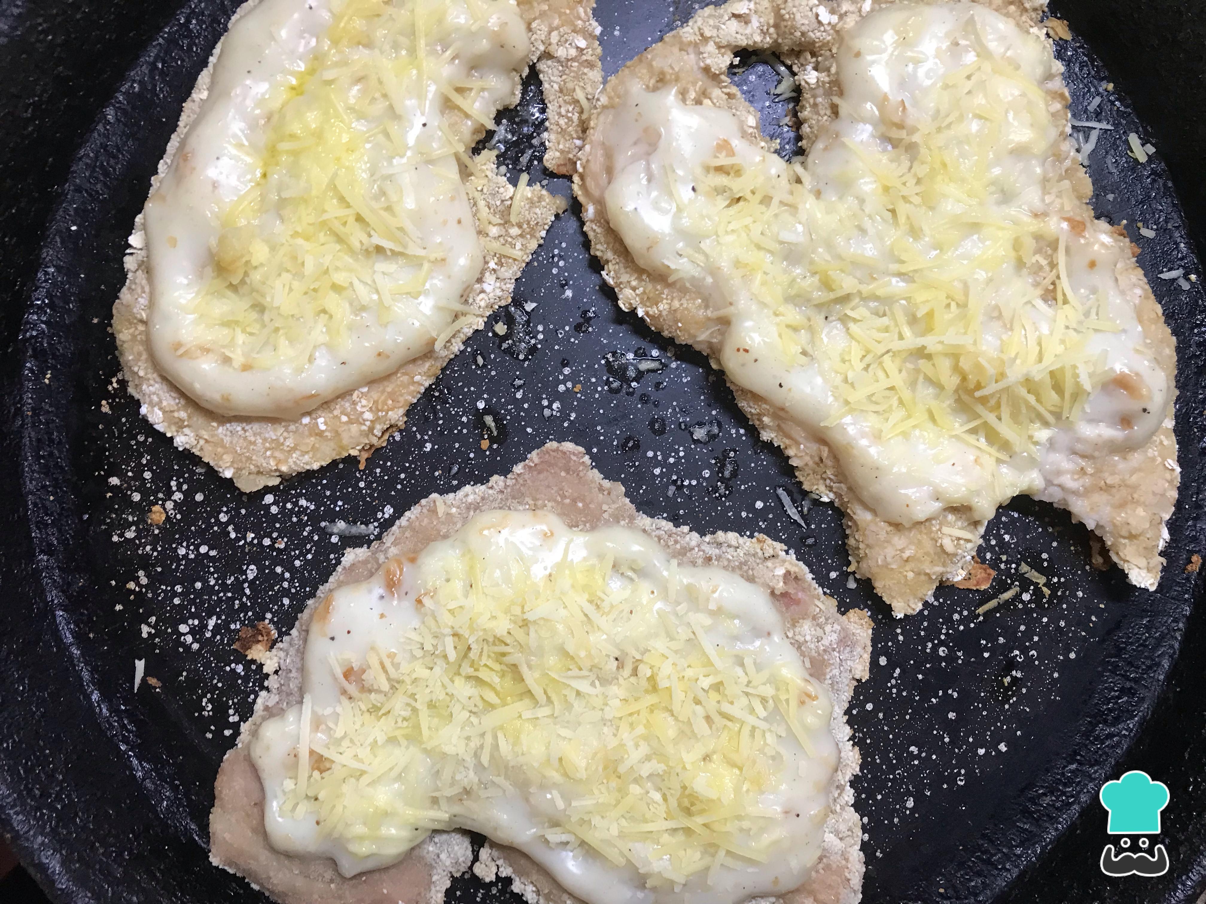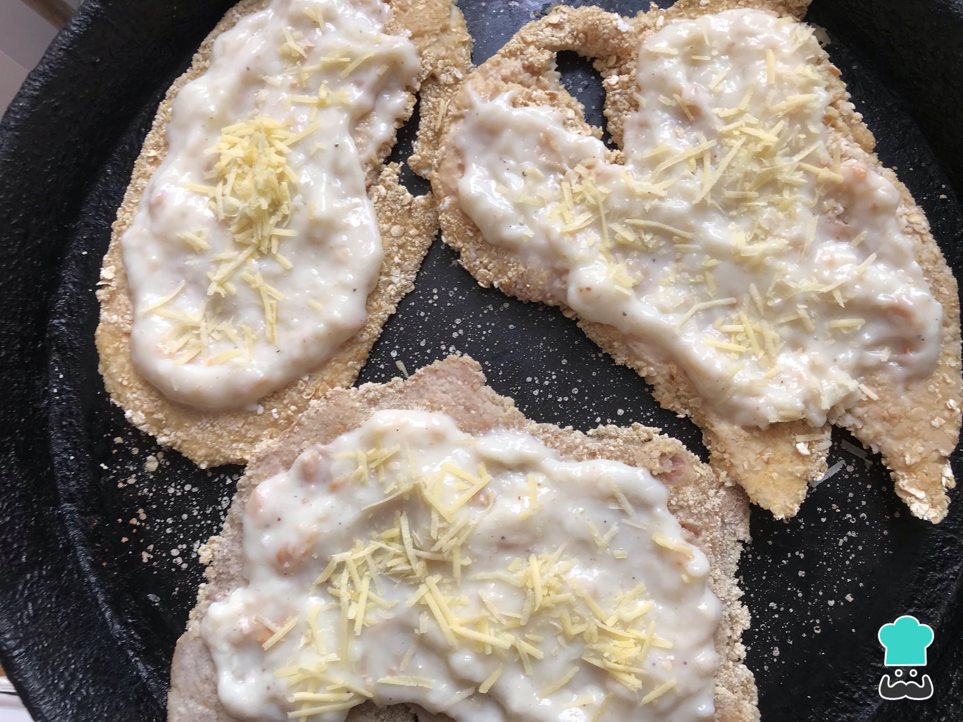 Truco: si has freído tus milanesas, cúbrelas con la salsa blanca y con todo el queso rallado. Caliéntalas en la parrilla del horno tan solo para que se gratinen.