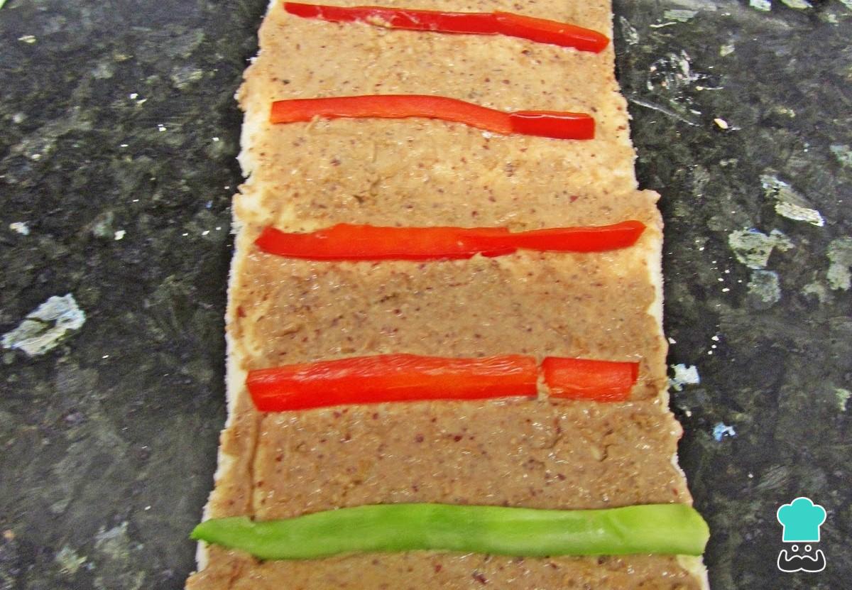 A continuación, unta el paté vegetal que hayas elegido por toda la superficie y coloca algunas tiras de pepino crudo y pimientos asados.