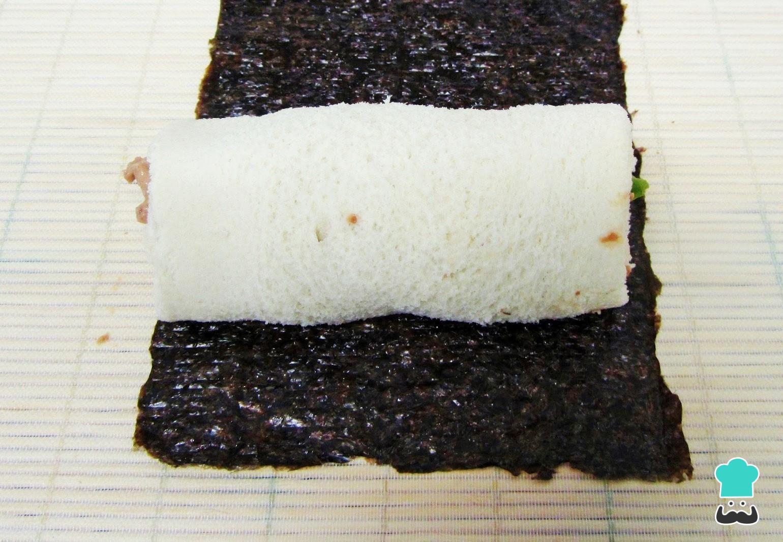 Enrolla el pan apretando bien y cuando tengas listo el rollo, envuélvelo en un trozo de alga nori, como si se tratase del clásico sushi california.