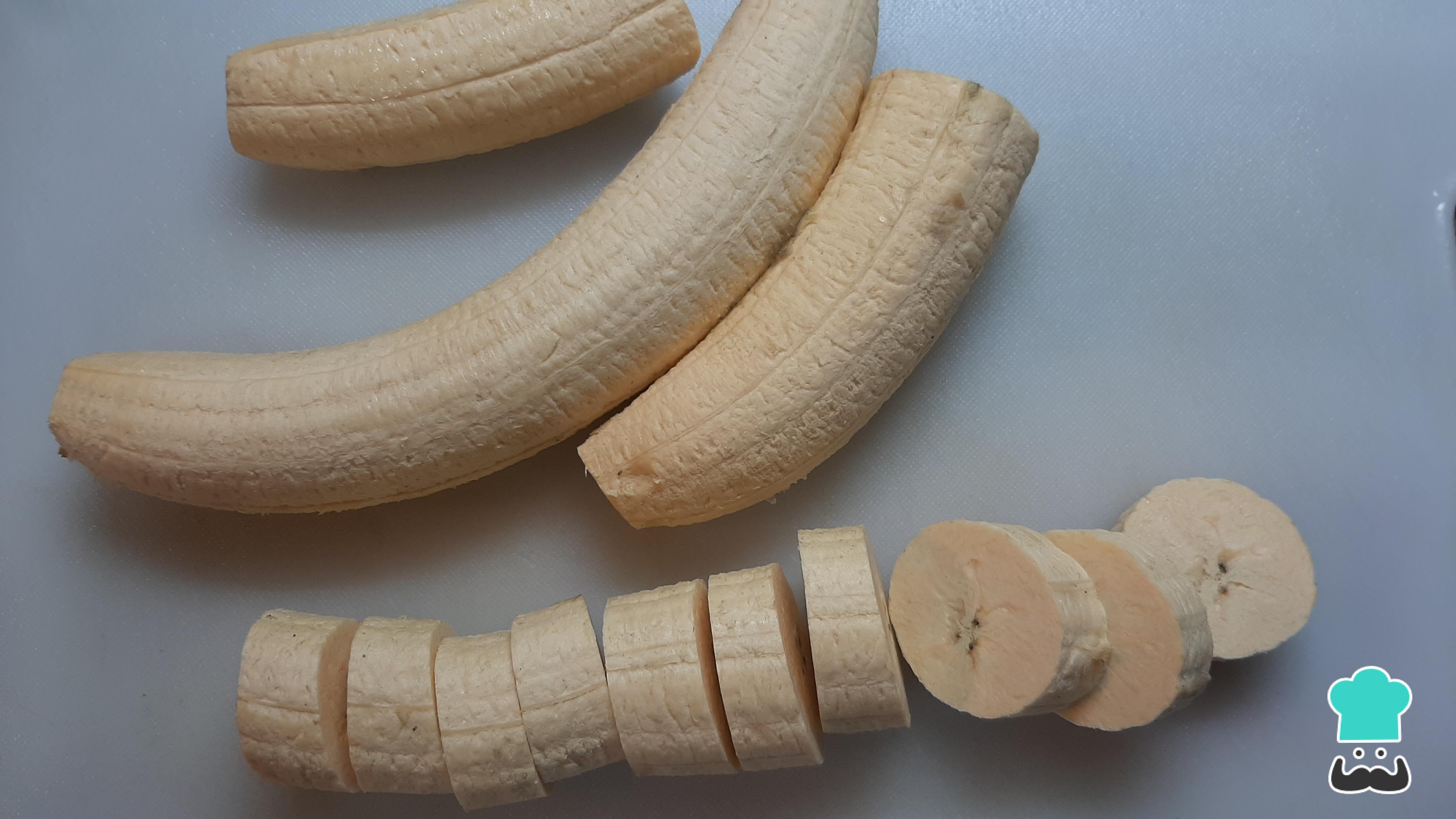 Empezamos con la receta de tacacho con cecina y chorizo amazónico. Debes pelar los plátanos y cortarlos en discos gruesos (no tienen que ser perfectos). Asimismo, debes cortar el cerdo en cubos pequeños.