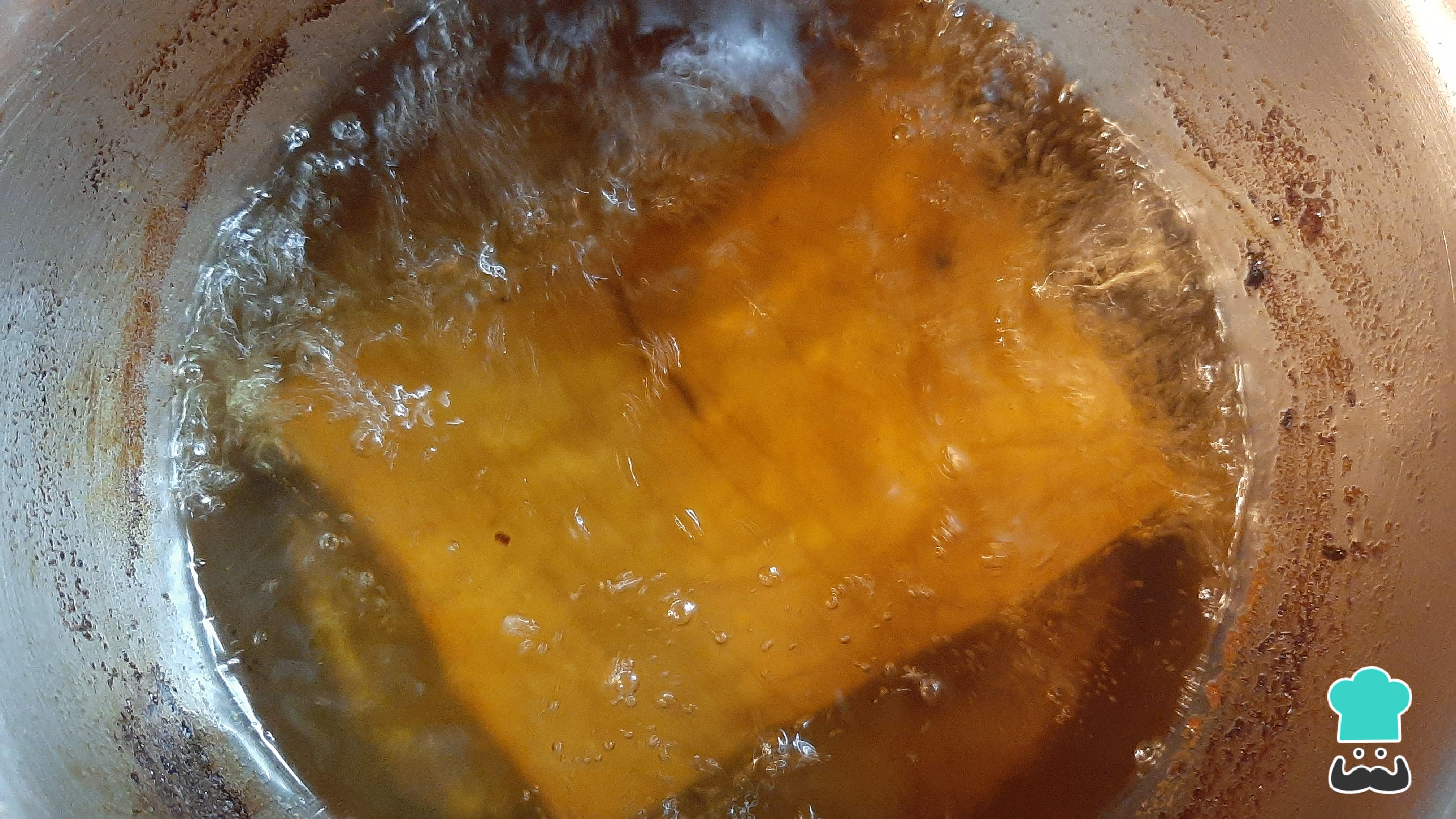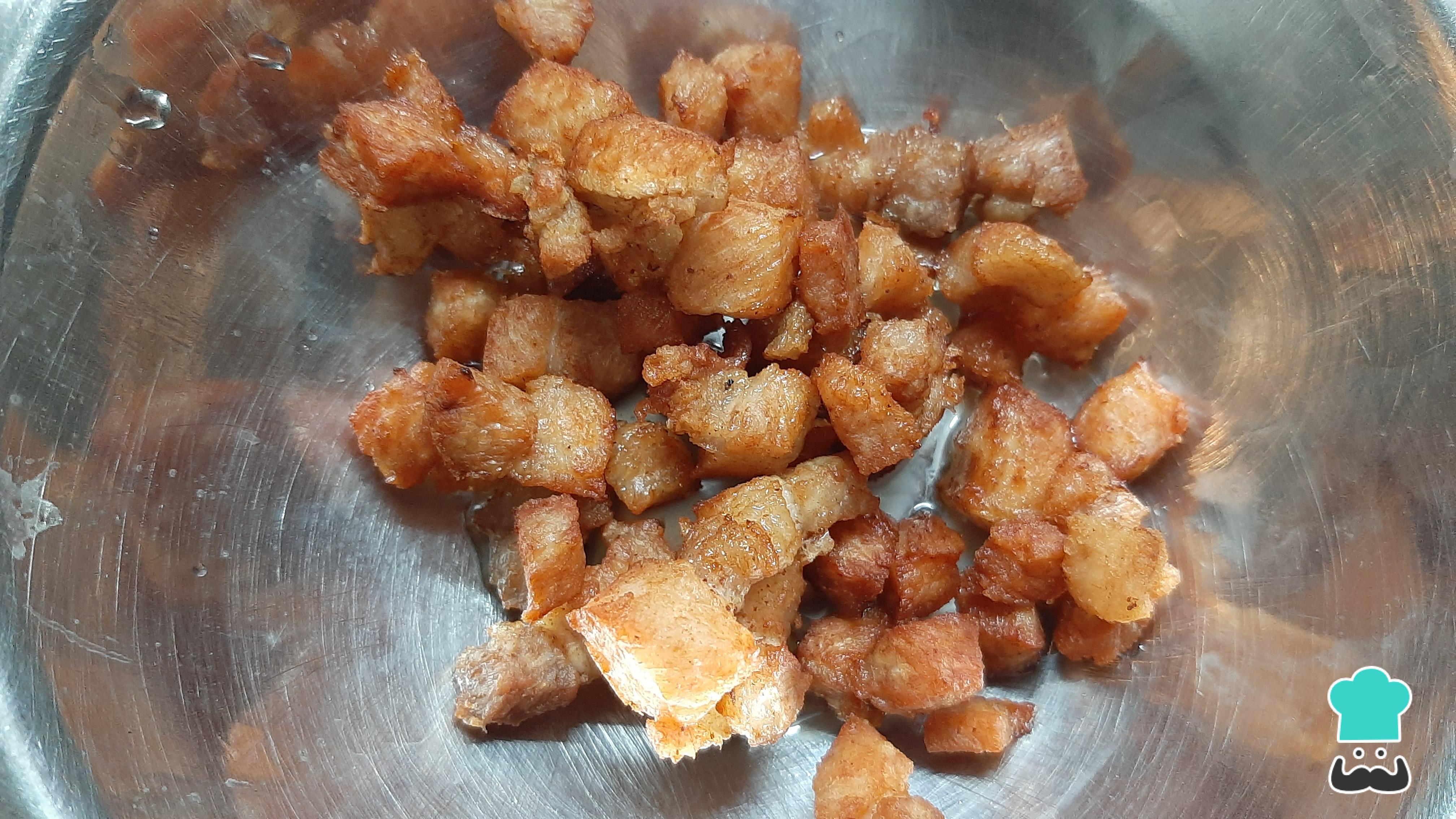 Calienta a fuego medio el aceite en una olla alta para evitar salpicaduras. Una vez el aceite se encuentre caliente, debes freír los cubos de cerdo hasta que estos obtengan un color dorado (chicharrón).