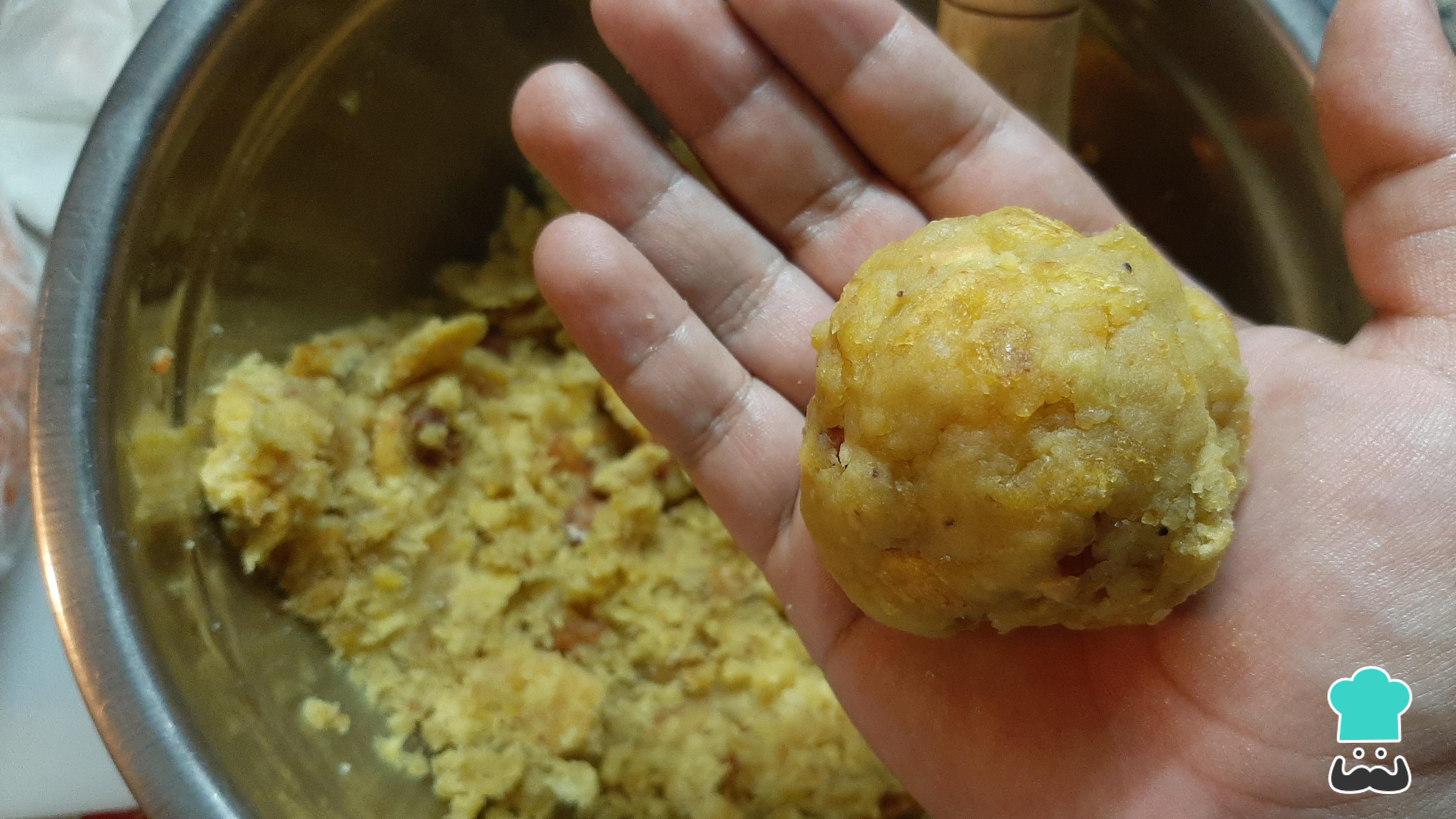 Añade a la masa los cubos de chicharrón de cerdo, sazonar con sal y forma las bolas de tacacho con ayuda de las manos.