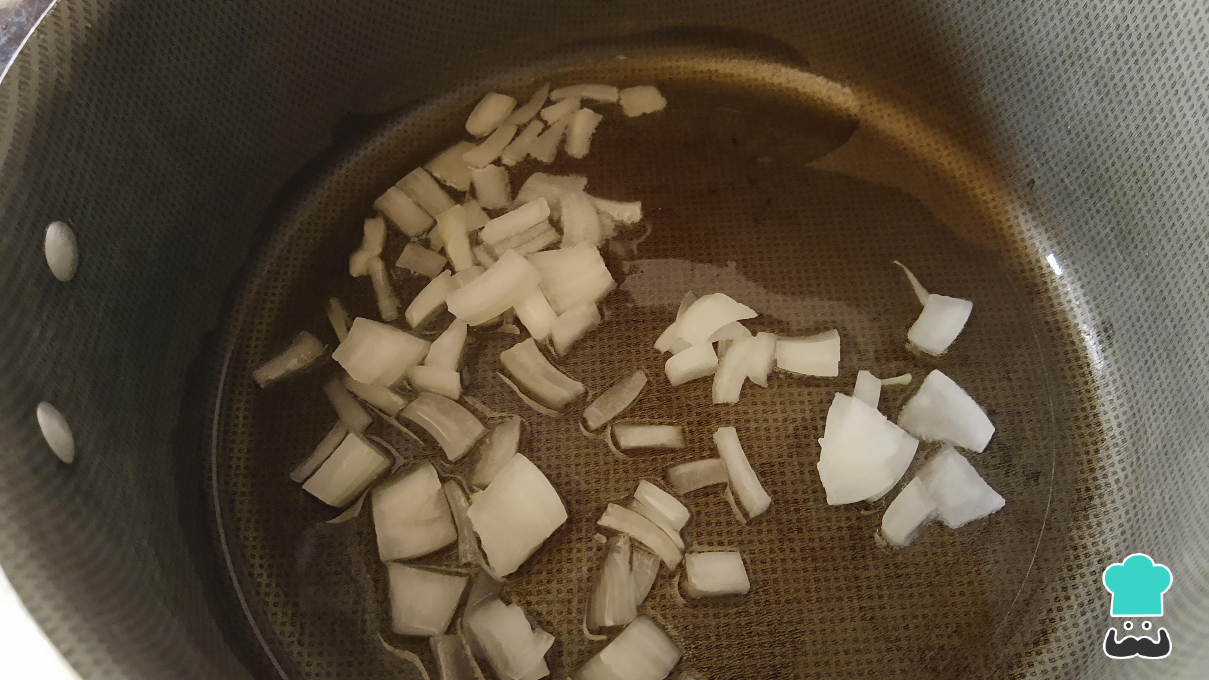 Empieza la receta de tacos de canasta veganos preparando el relleno de los tacos. Para ello, calienta en una olla 2 cucharadas de aceite y añade la cebolla picada. Cocina hasta dorar.