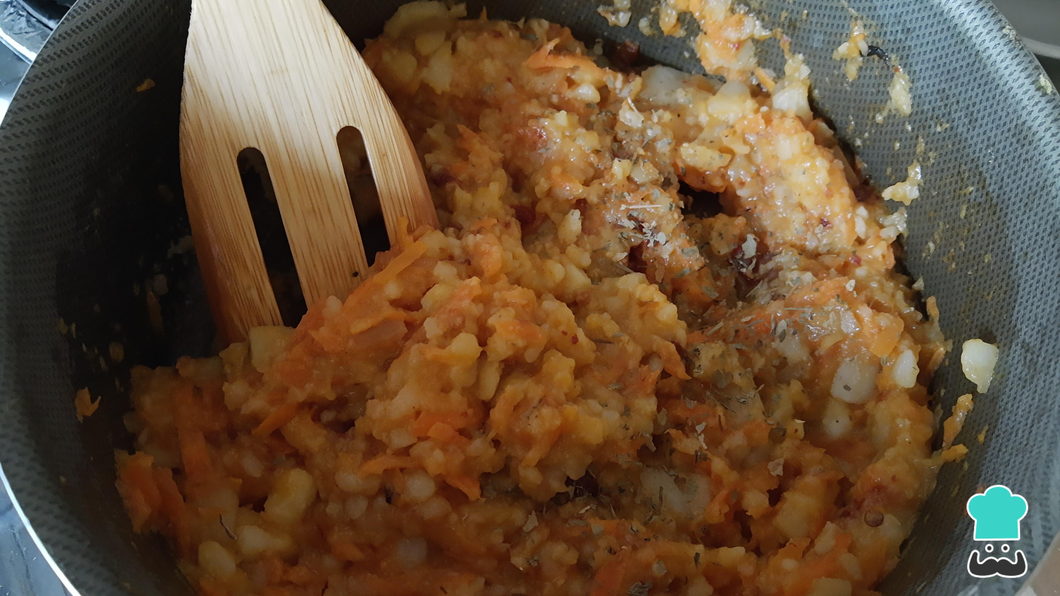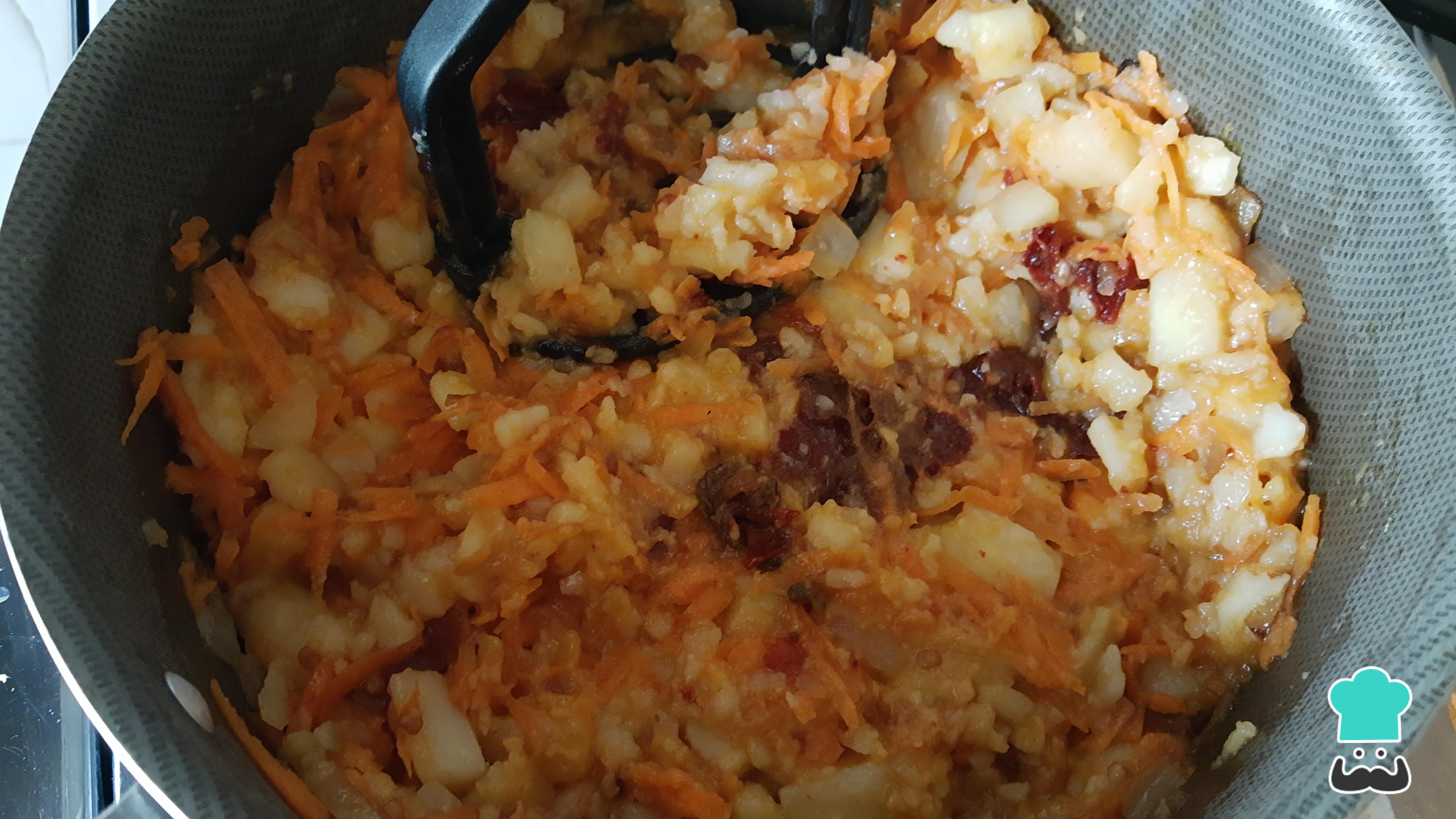 Agrega la papa cocida en cubos, la zanahoria rallada y el chile chipotle. Seguido, con ayuda de un machacador aplasta hasta obtener una especie de puré espeso.