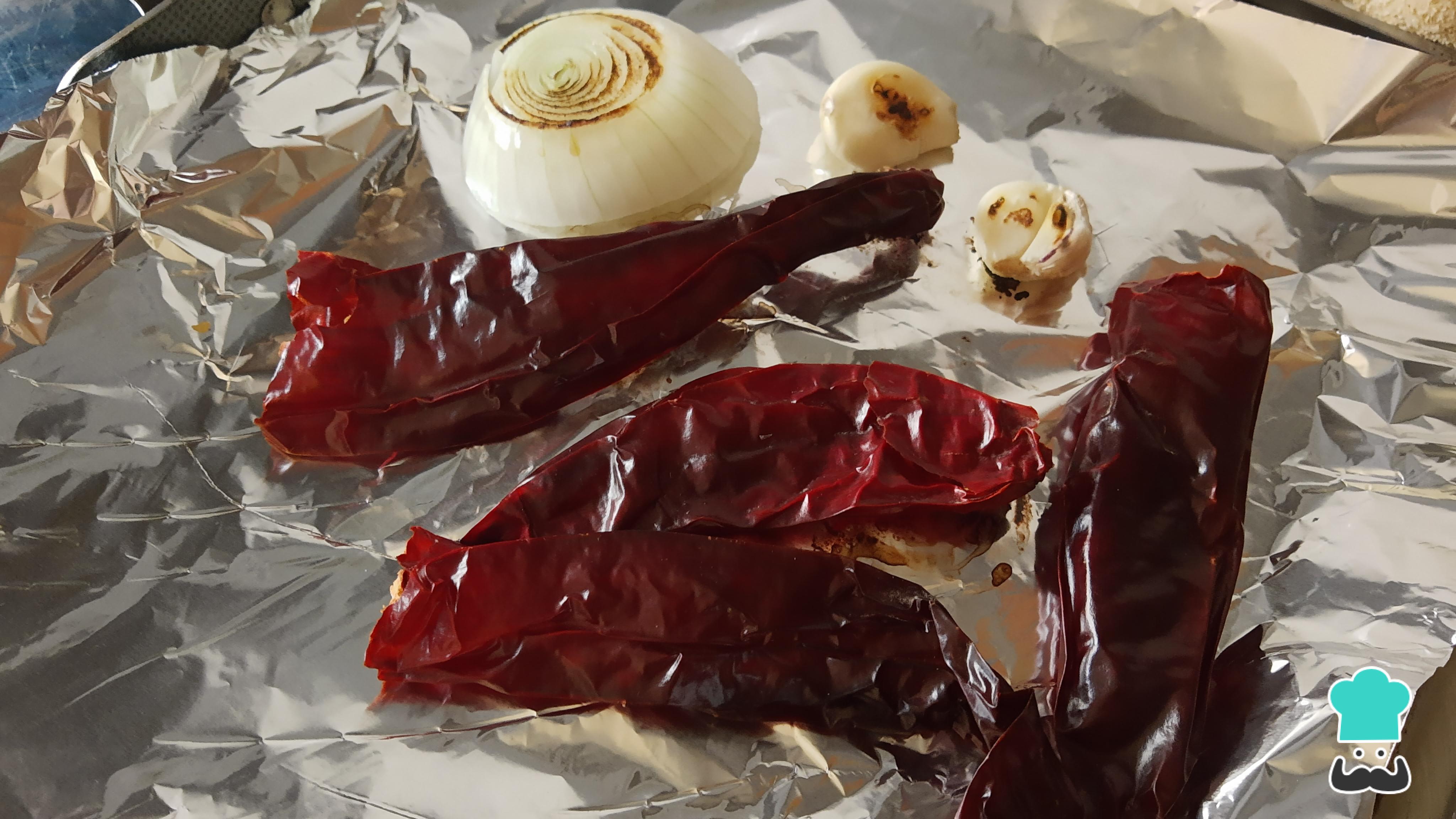 Prepara el adobo. Para ello, tatema los chiles guajillo, deben estar limpios sin venas ni semillas, añade también el trozo de cebolla y los dientes de ajo. No dejes que se quemen o amargará el adobo.