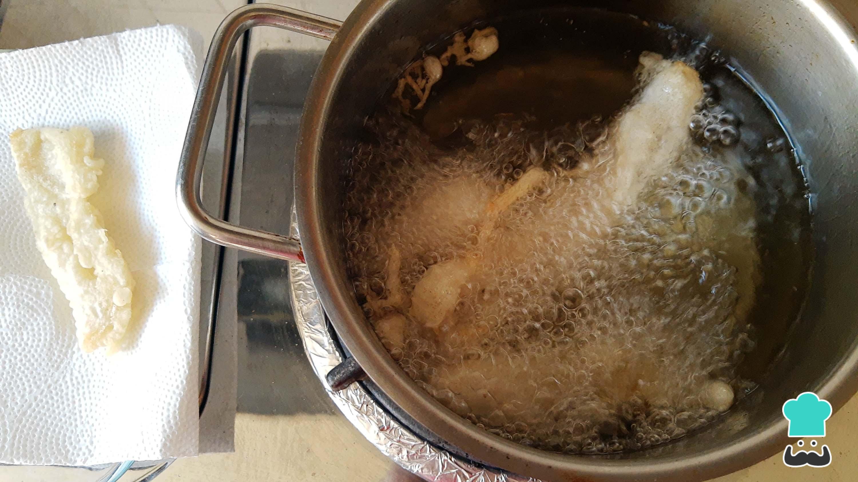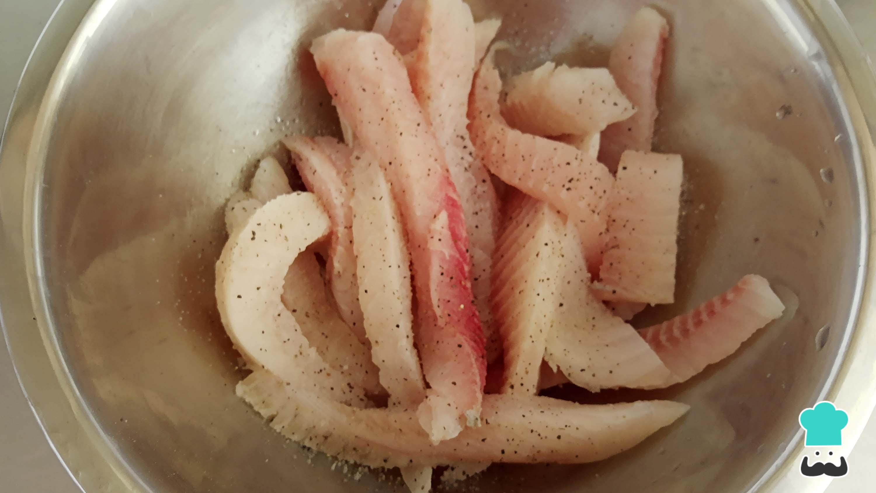 Pon a calentar suficiente aceite en una olla. Mientras se calienta el aceite, pasa las tiras de pescado por la mezcla anterior para rebozarlas.
