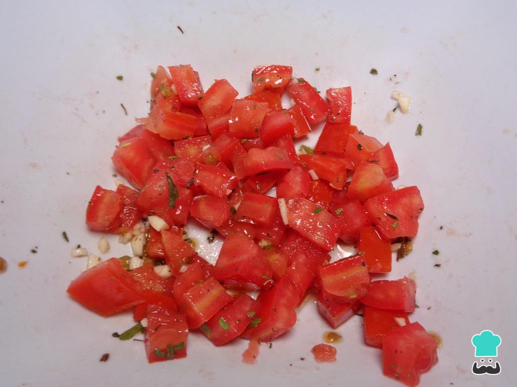 Por otro lado, prepararemos la salsa pico de gallo: para esto picamos finamente el tomate rojo y el diente de ajo, los colocamos en un tazón, añadimos la mejorana picada, el vinagre de jalapeños, el azúcar y la sal, y mezclamos un poco hasta que todo esté integrado cuidando no estropear demasiado el tomate rojo, y reservamos.