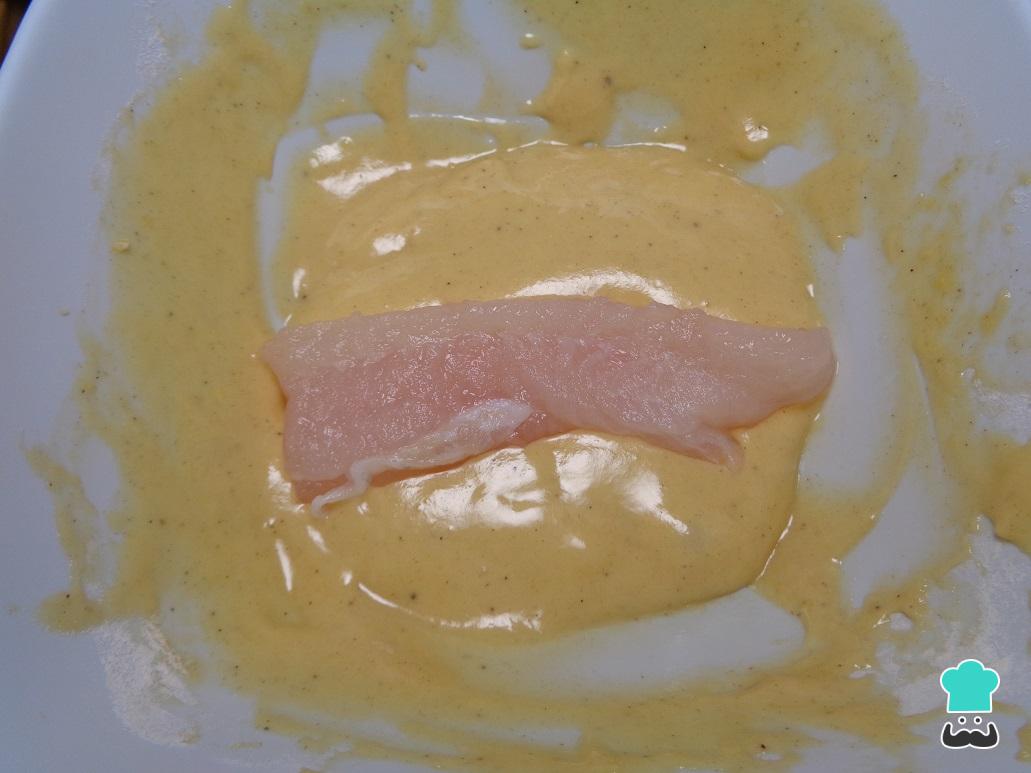 Pasados los 30 minutos de reposo de la mezcla para capear, retiramos del refrigerador e introducimos las tiras de pescado en la mezcla cubriéndolas completamente de esta.