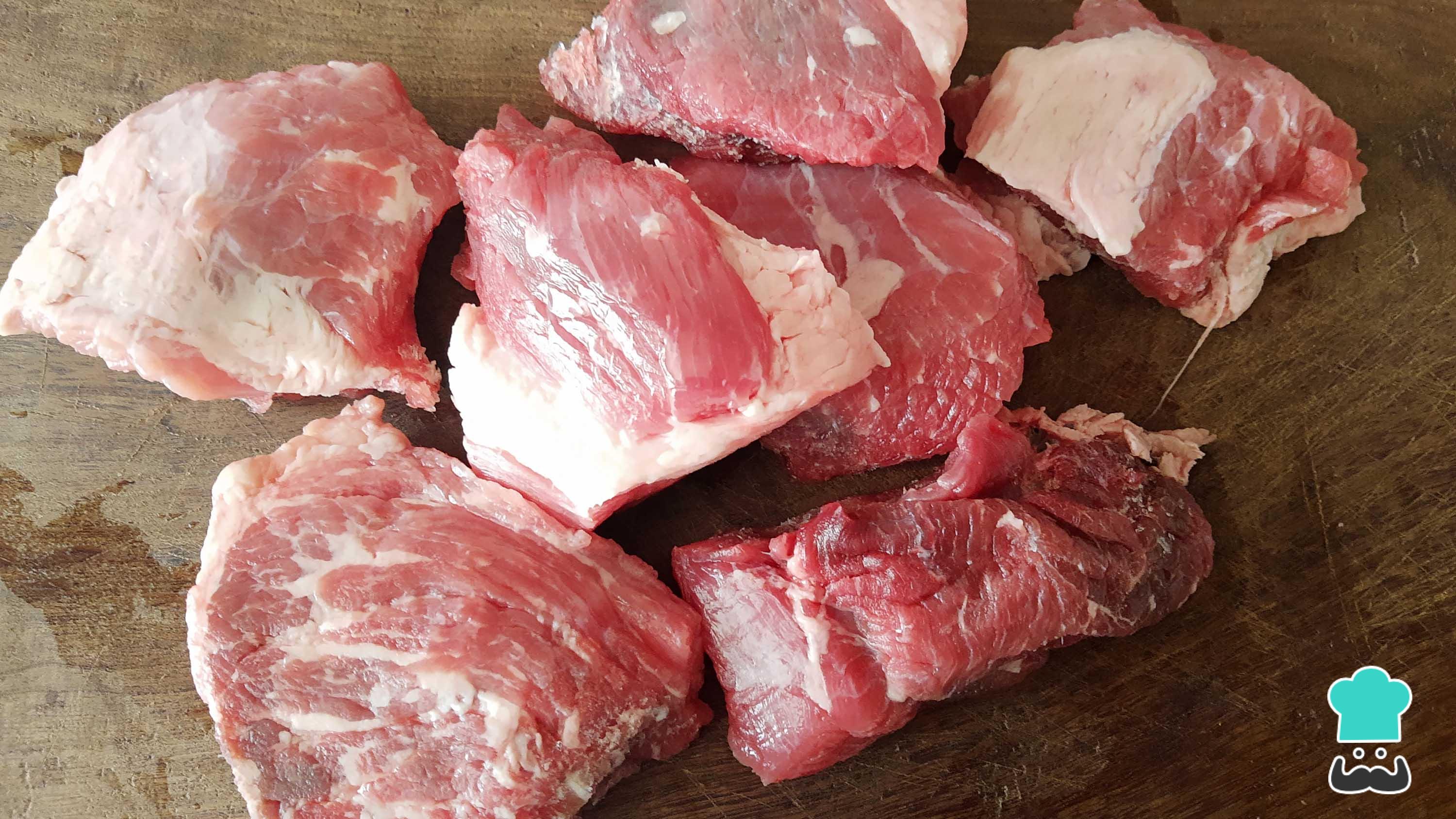Comienza la receta de tacos de barbacoa cortando la carne de res. Puedes utilizar chambarete, falda o cualquier otro corte que se deshebre fácil.