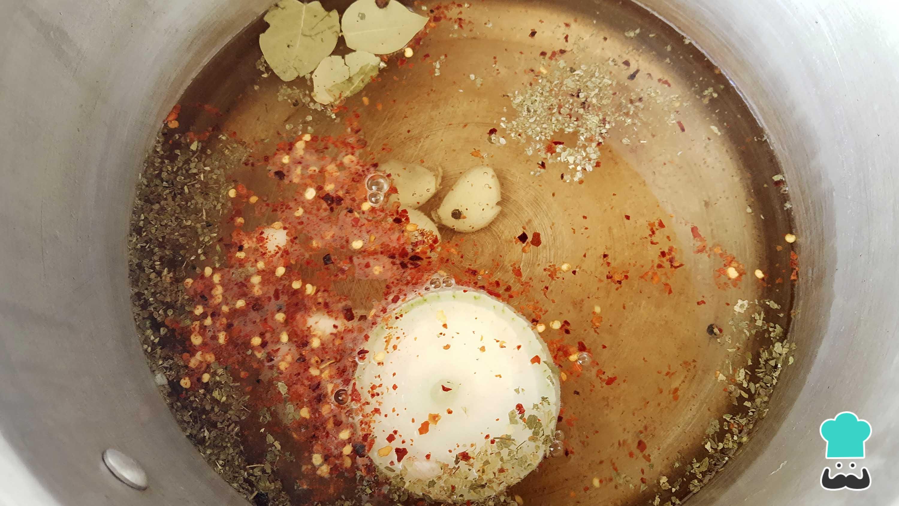En una olla con 1 litro y medio de agua, agrega los dientes de ajo, las hojas de laurel, las pimientas negras enteras, una pizca de orégano seco, una pizca de tomillo, una pizca de mejorana, un trozo de cebolla, sal al gusto y, opcionalmente, chile quebrado seco. Deja que comience a hervir.