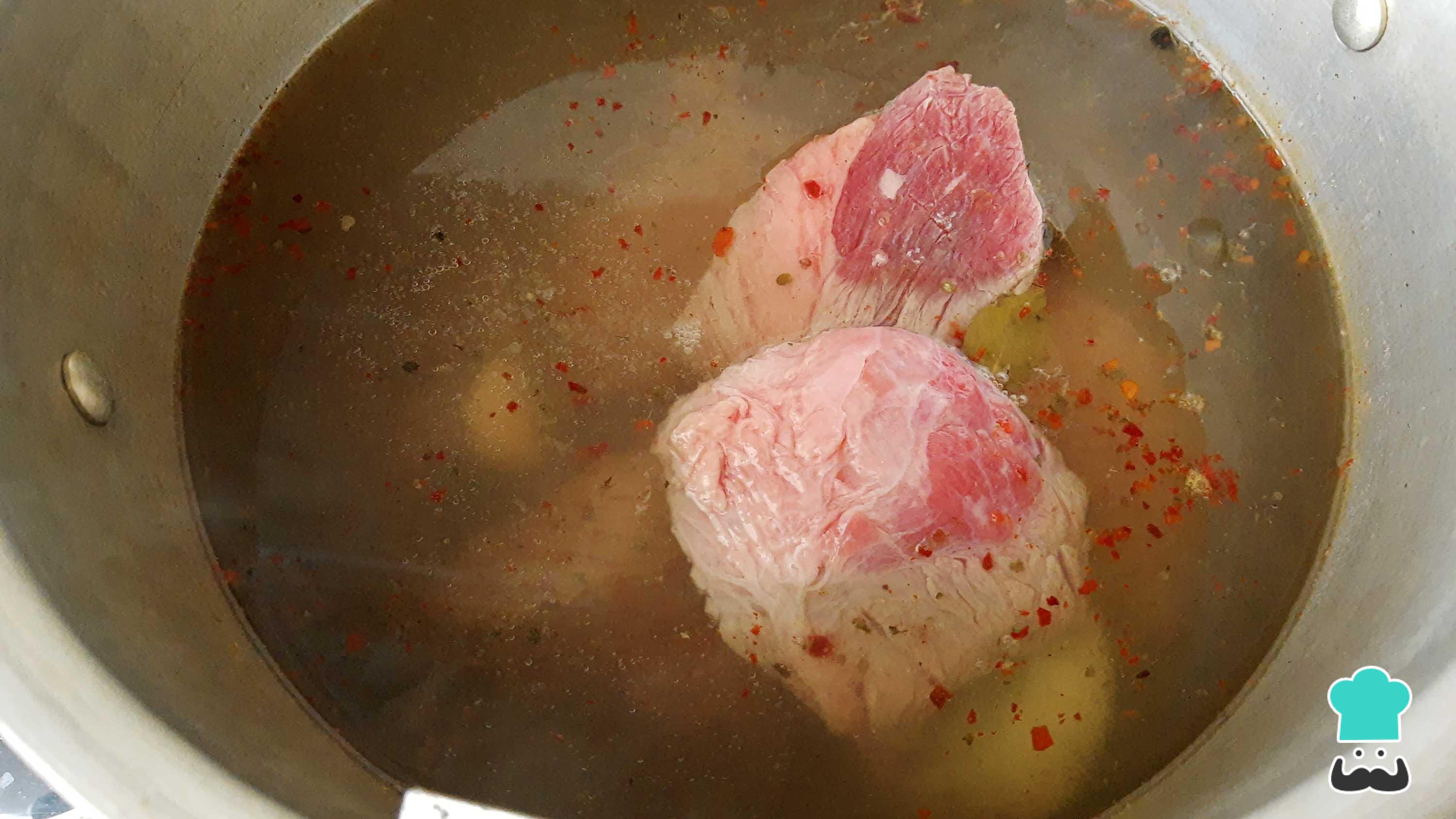 Cuando esté hirviendo, agrega la carne de res, baja el fuego y deja que se cocine todo junto. El tiempo de cocción dependerá del tipo de olla, si utilizas olla de presión bastará con unos 30 minutos, mientras que si decides usar una olla convencional tomará alrededor de 2-3 horas, ya que necesitas que la carne esté suave y se deshebre fácilmente.