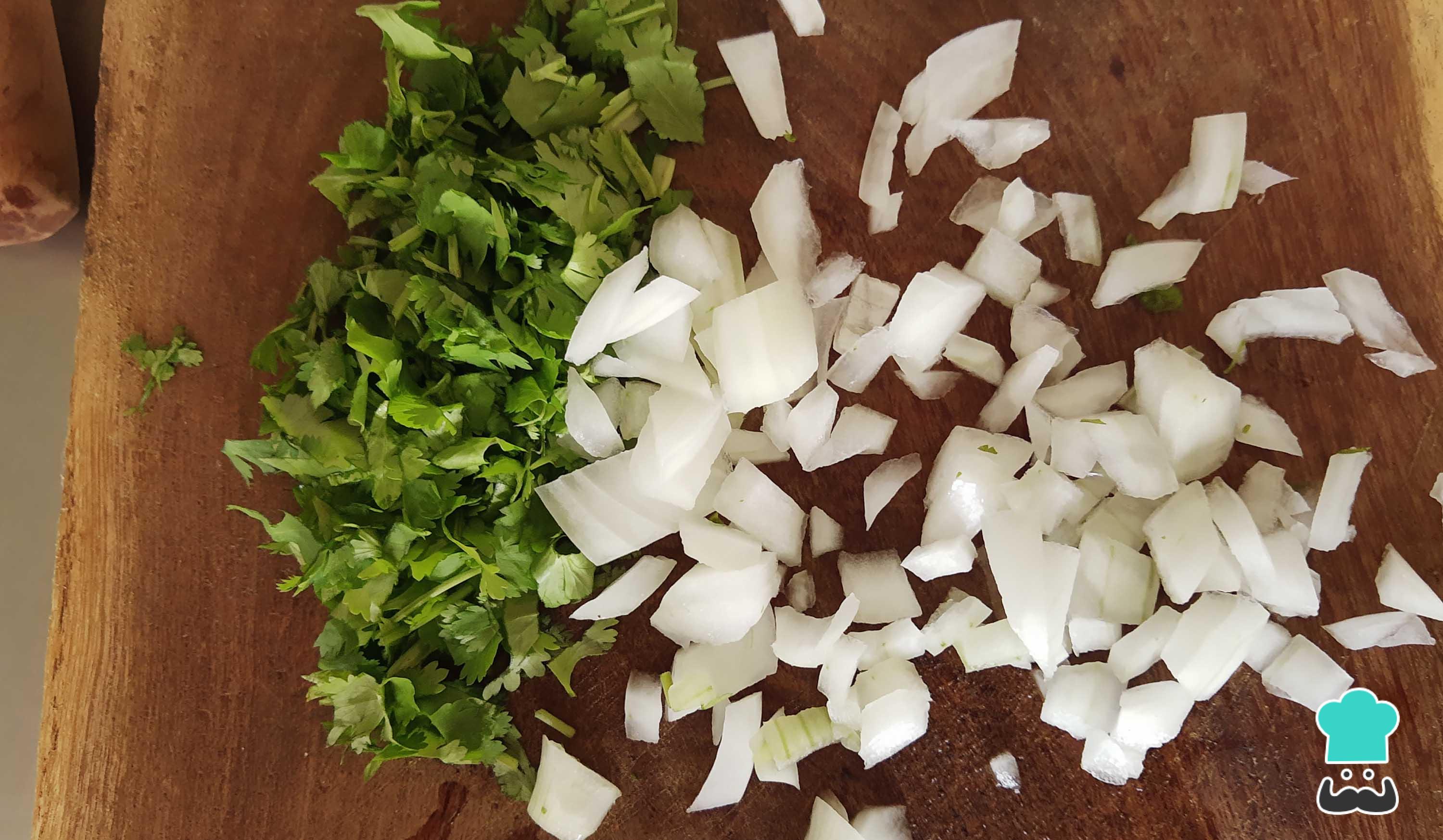 Mientras se cocina la carne, pica finamente una cebolla mediana y una rama de cilantro. Reserva ambos ingredientes para seguir con la receta de tacos de barbacoa.