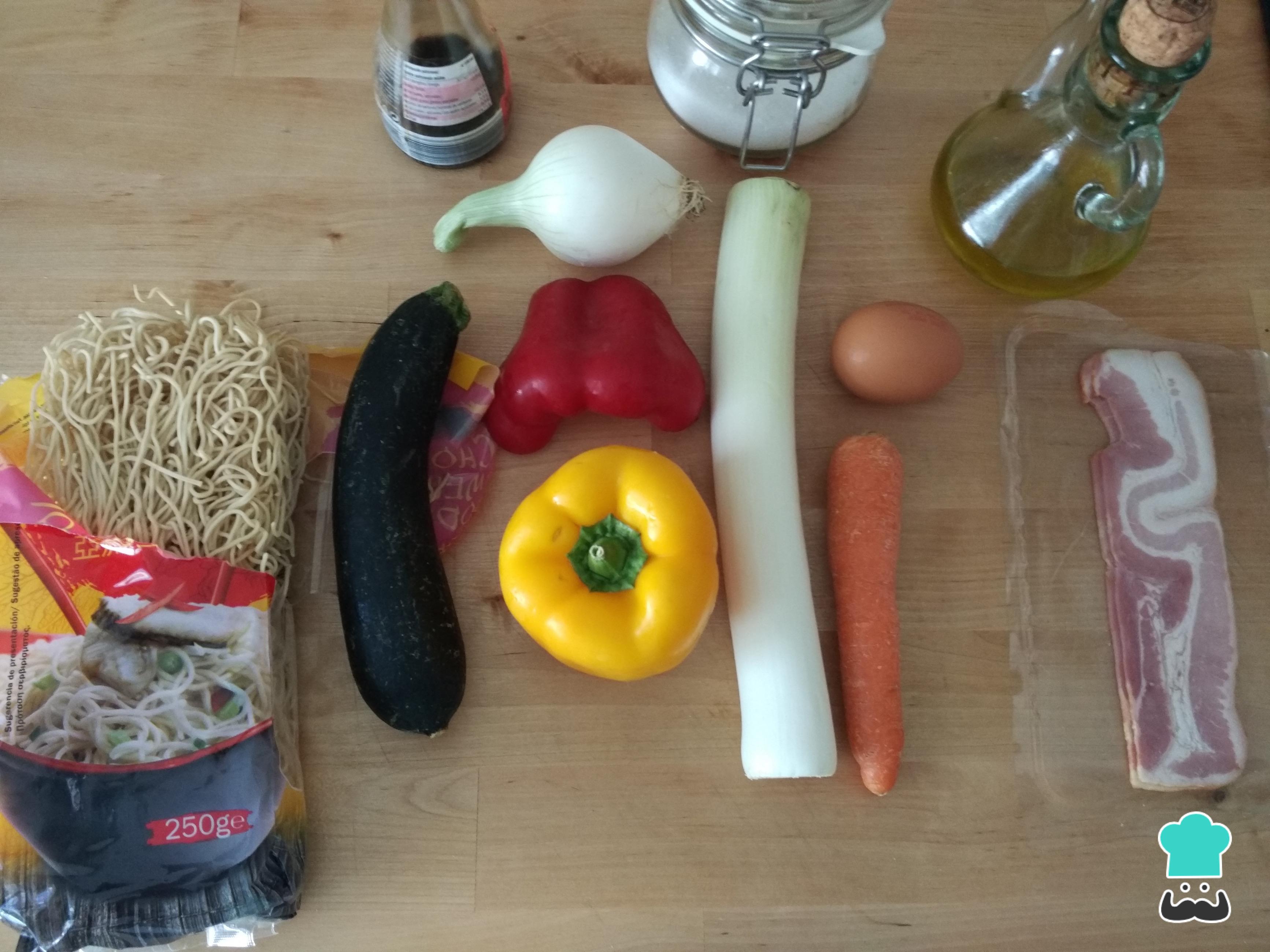 Reunimos todos los ingredientes para preparar los tallarines chinos tres delicias.
