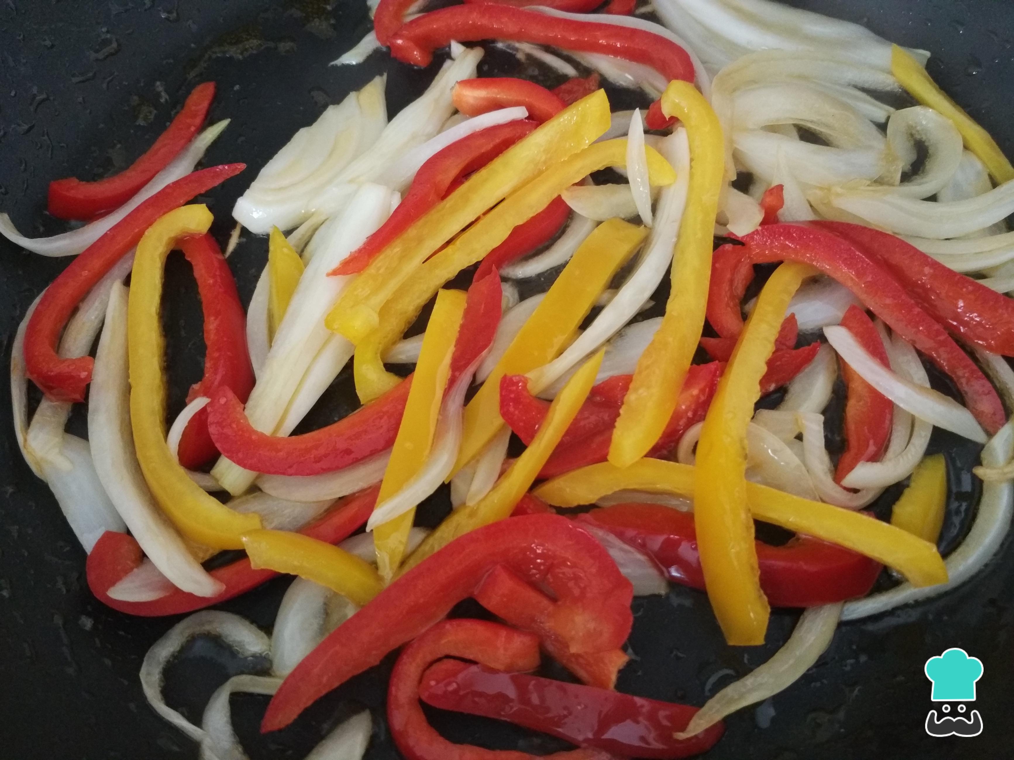 Salteamos la cebolleta, el pimiento amarillo y el pimiento rojo en una sartén con aceite de oliva. Dejamos que se cocinen durante 3 minutos a fuego medio.