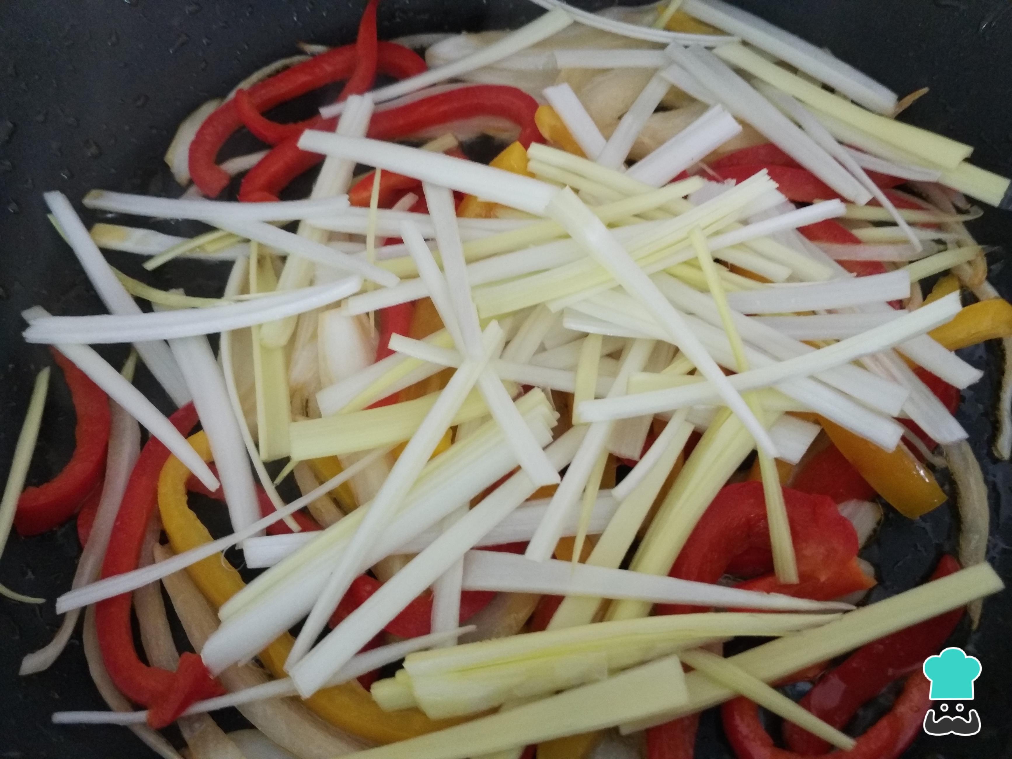 Quitamos la parte exterior del puerro, lo cortamos en tiras y lo añadimos al sofrito junto a los pimientos y la cebolleta para continuar con la receta estilo chino.