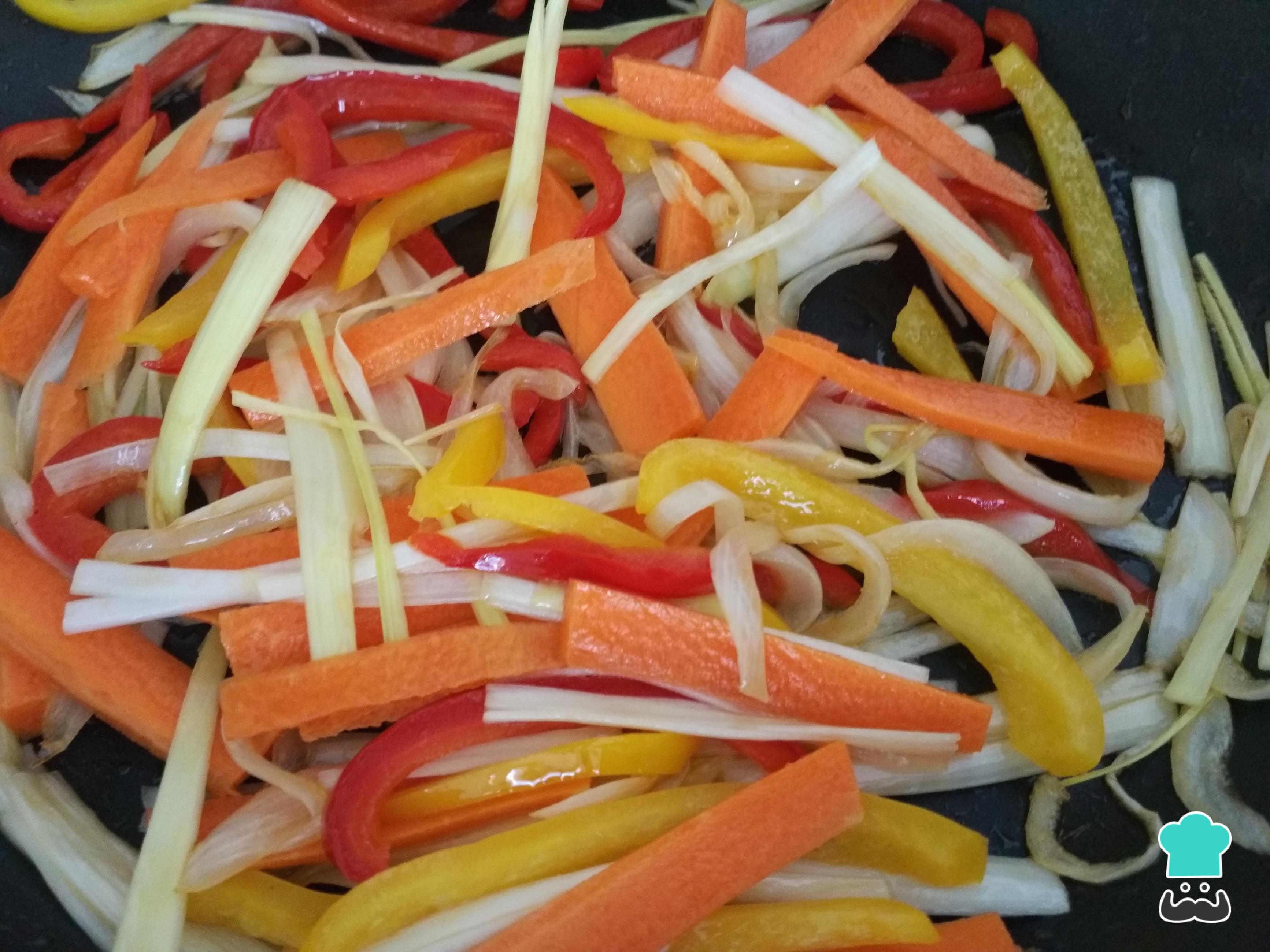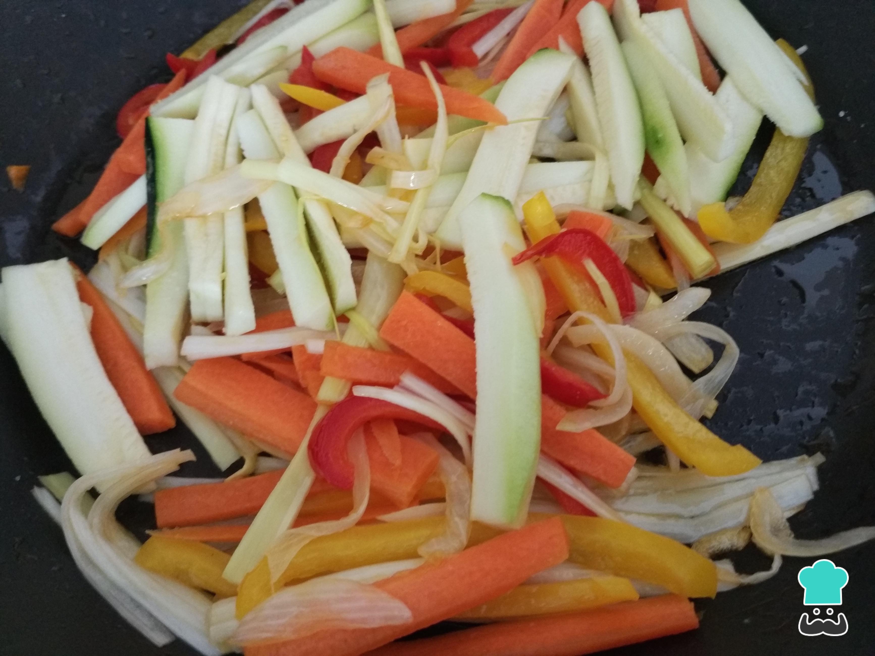 Pelamos la zanahoria, la partimos en bastoncitos y la añadimos a la sartén con el resto de verduras. Dejamos cocinar durante 3 minutos más.