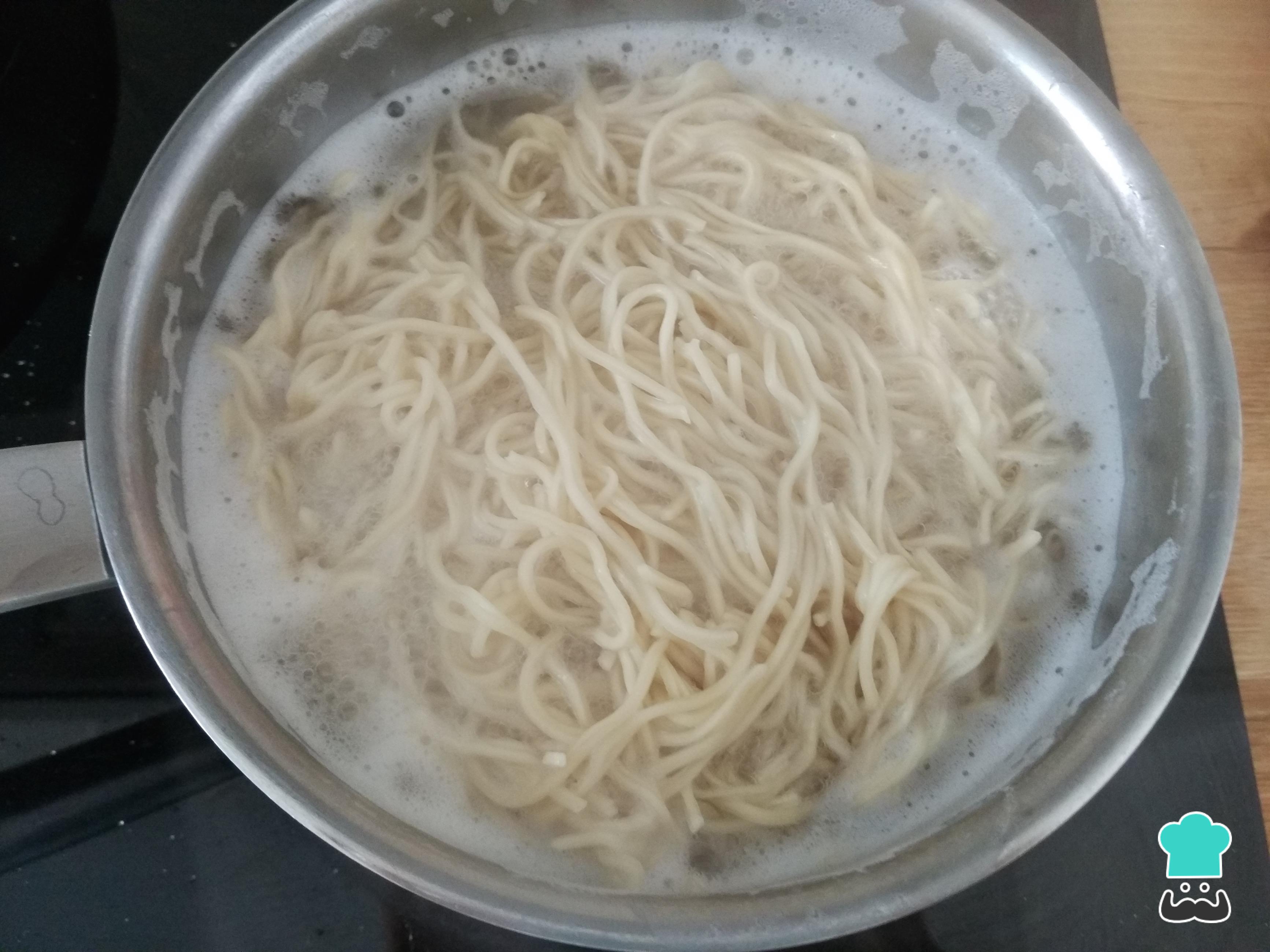 Mientras tanto, cocemos los tallarines chinos en abundante agua hirviendo con sal. El tiempo de cocción dependerá de las instrucciones del fabricante.