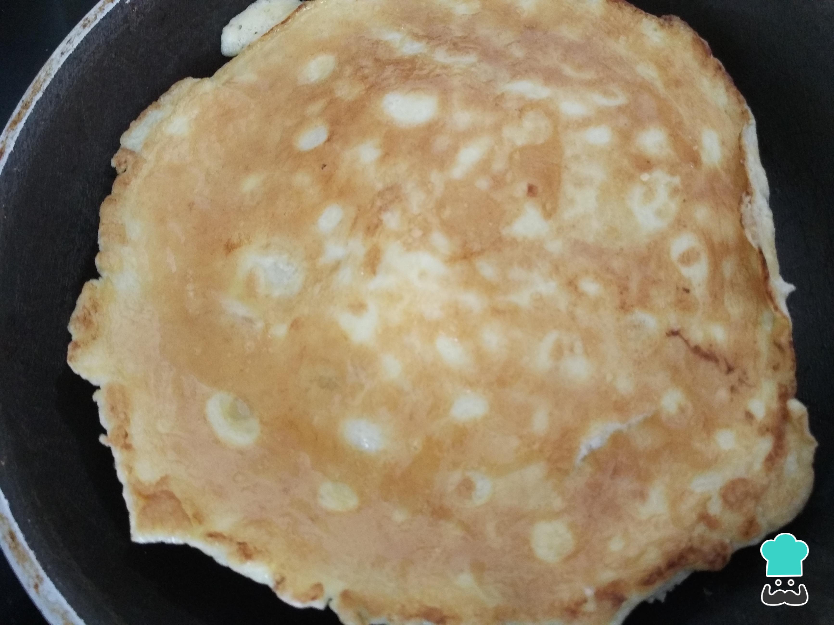 Del mismo modo, preparamos una tortilla francesa. Para ello, batimos el huevo, ponemos un poco de sal y cocemos la tortilla en una sartén con un poco de aceite de oliva. Y si queréis hacer al microondas para ir más rápido y no utilizar aceite, no os perdáis la receta de tortilla francesa al microondas. Cuando esté cocinada esperamos a que se enfríe y la cortamos en cuadraditos. Reservamos.