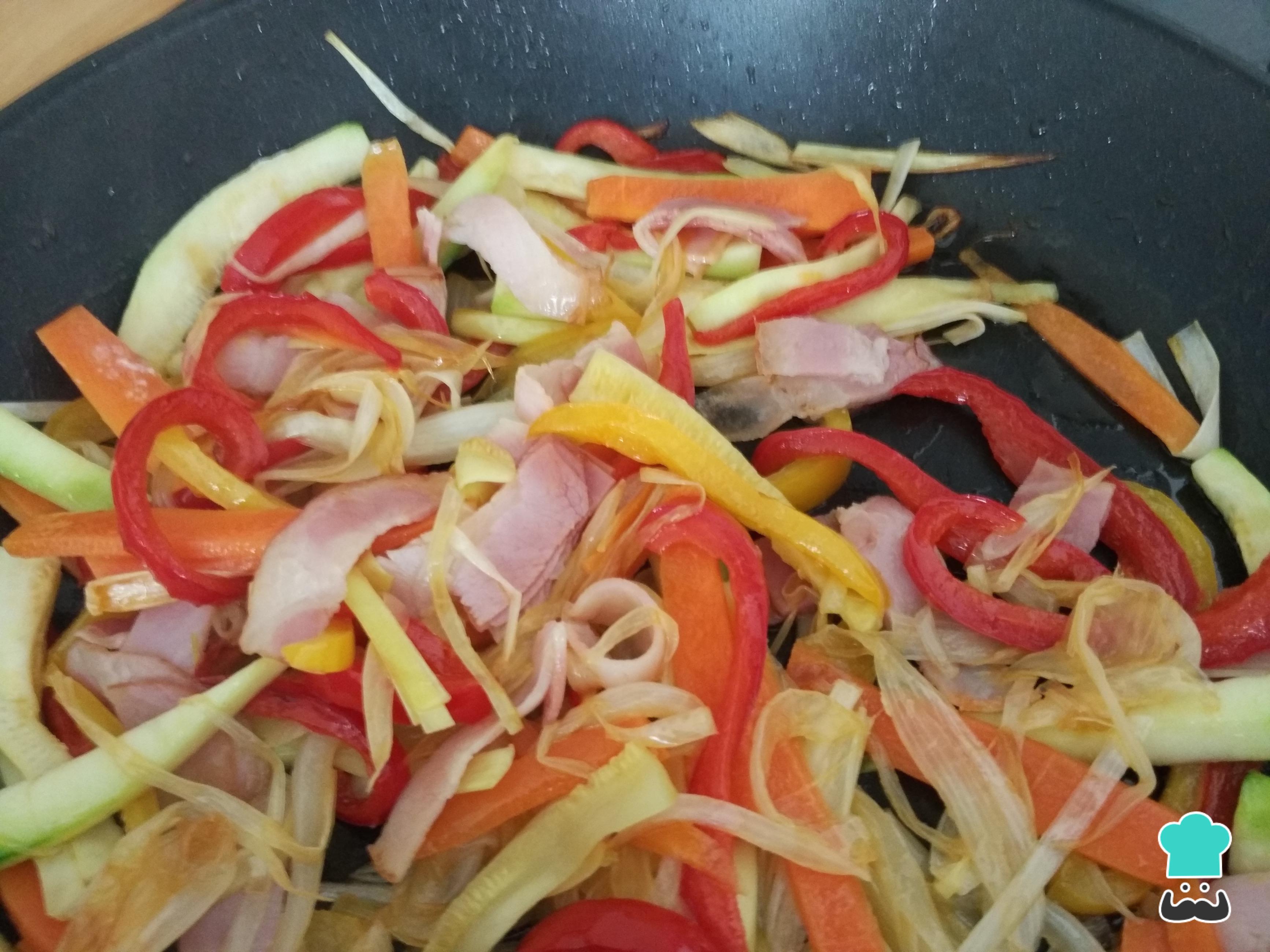 Añadimos el bacon ahumado al salteado de verduras para nuestros tallarines chinos tres delicias y dejamos que se cocine.