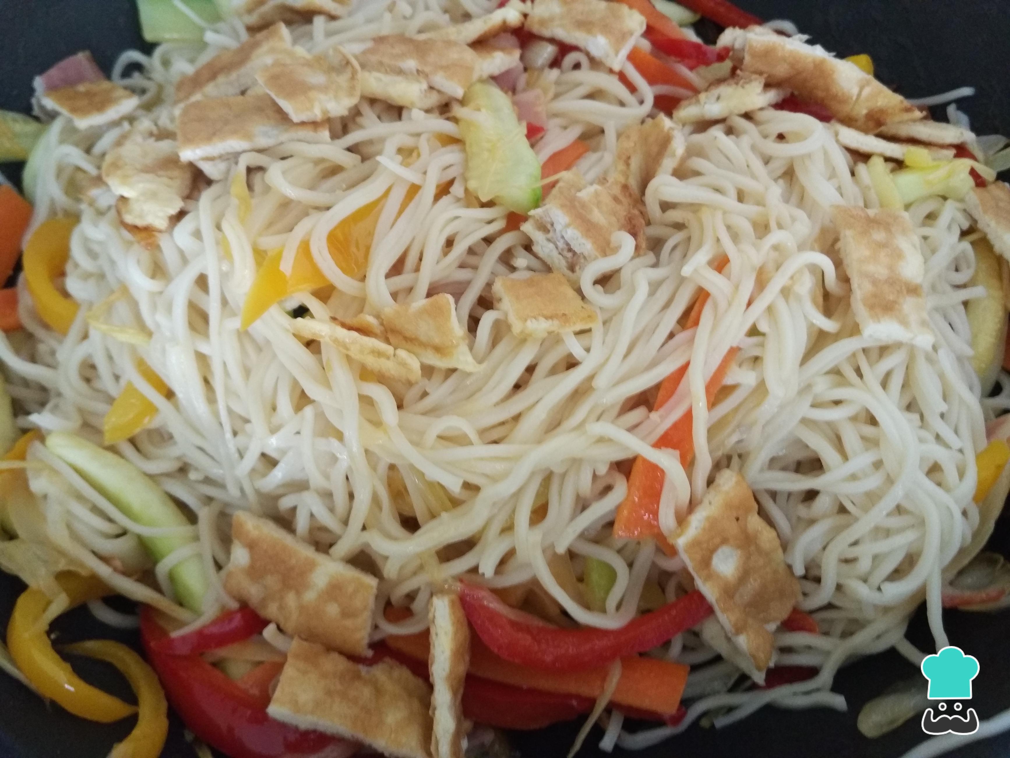 Añadimos los tallarines chinos al sofrito, agregamos la tortilla en trocitos y aderezamos con un poco de salsa de soja o salsa teriyaki.