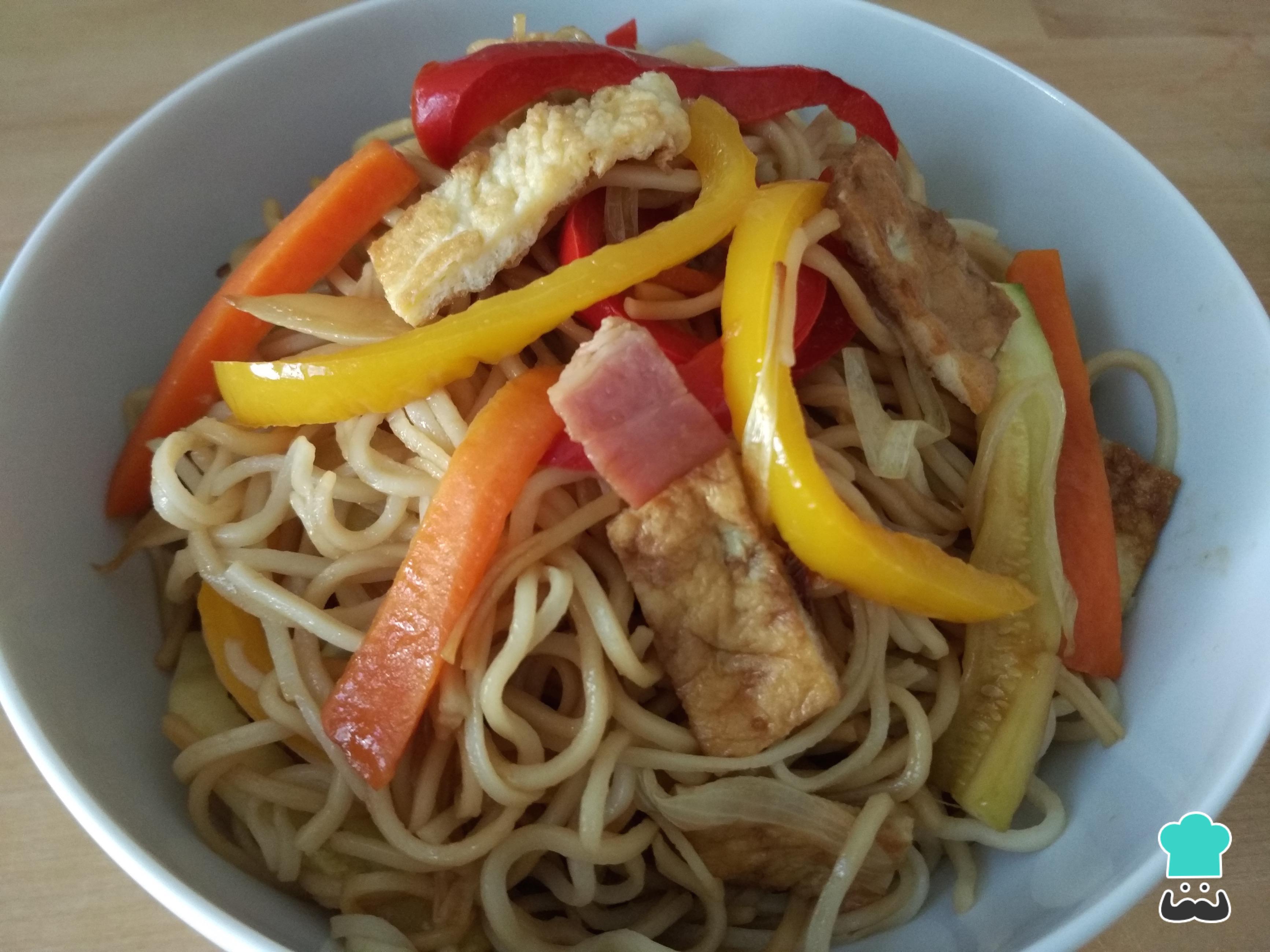 Nosotros hemos variado la receta incluyendo tallarines, agregando bacon y prescindiendo de los guisantes. ¡Probad a preparar estos tallarines chinos y contadnos qué os parece el resultado!