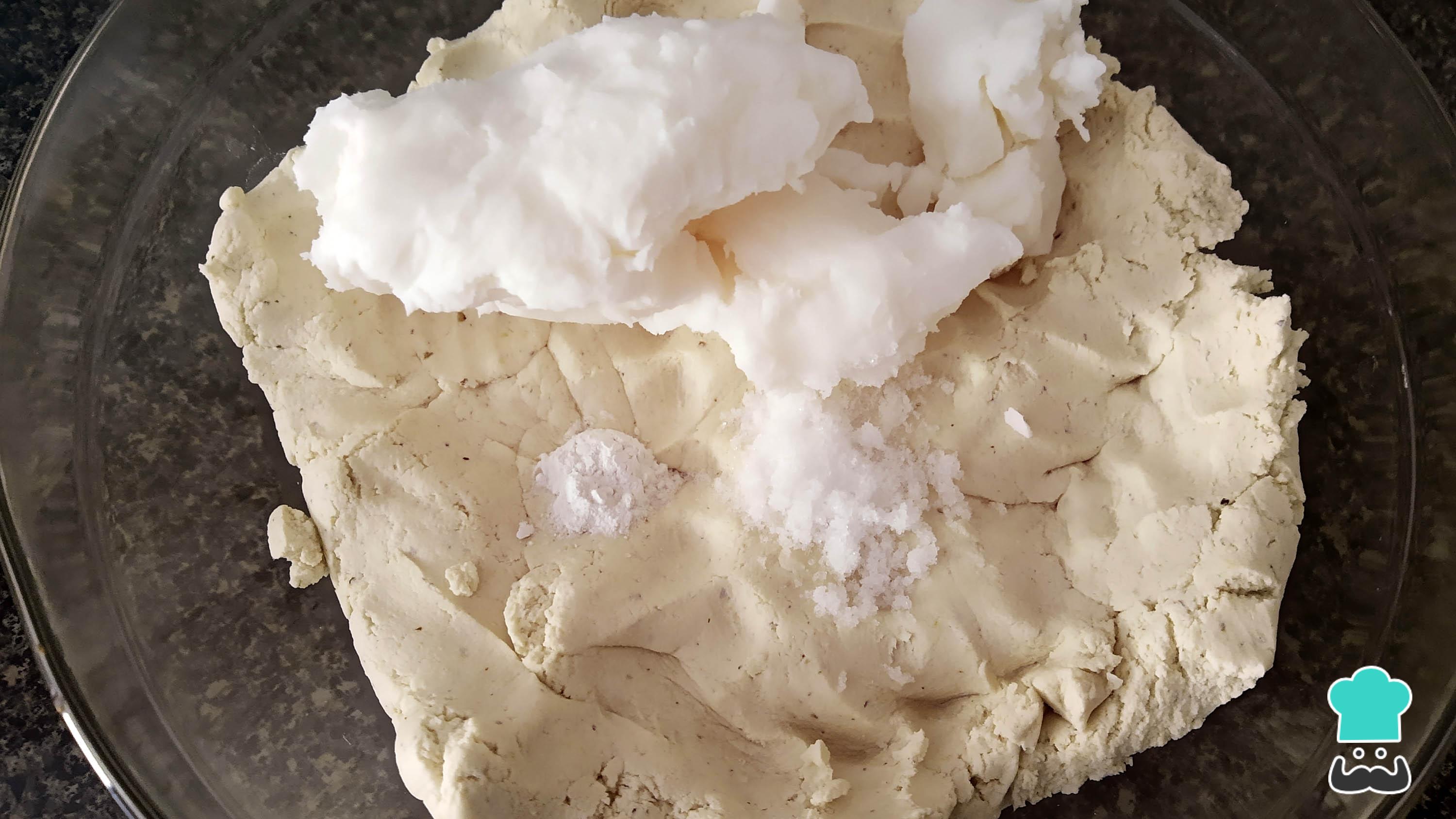 Cuando tengas tu masa, agrega la cucharada de sal, el polvo para hornear y la manteca, que debe estar suavizada y a temperatura ambiente.