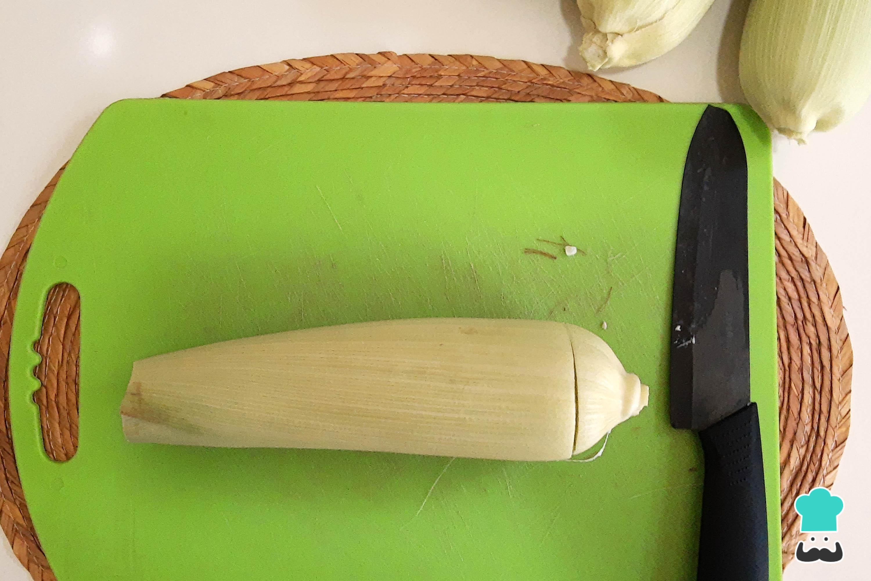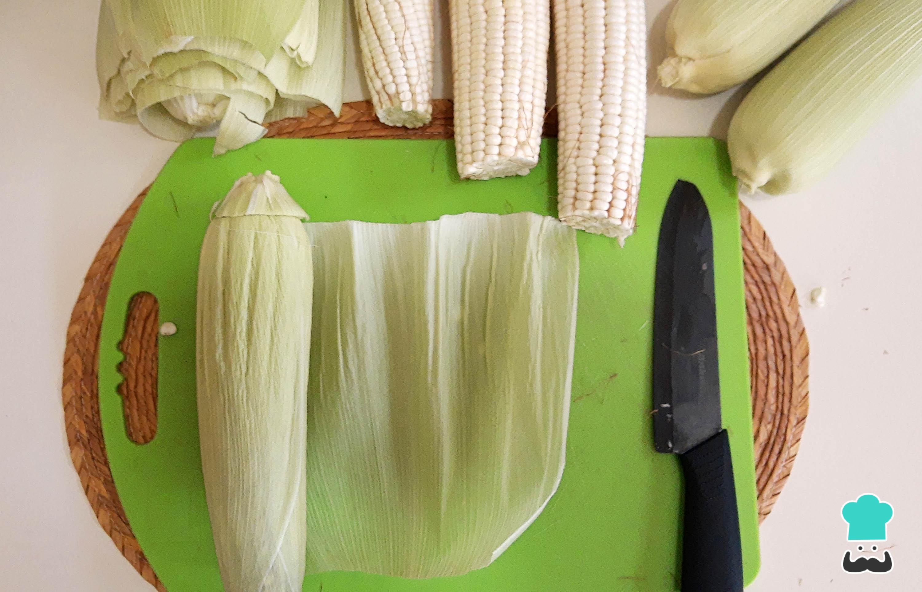 Quita una por una las hojas con cuidado de no romperlas. Cuando las hayas quitado todas, limpia bien elote quitando el pelo.