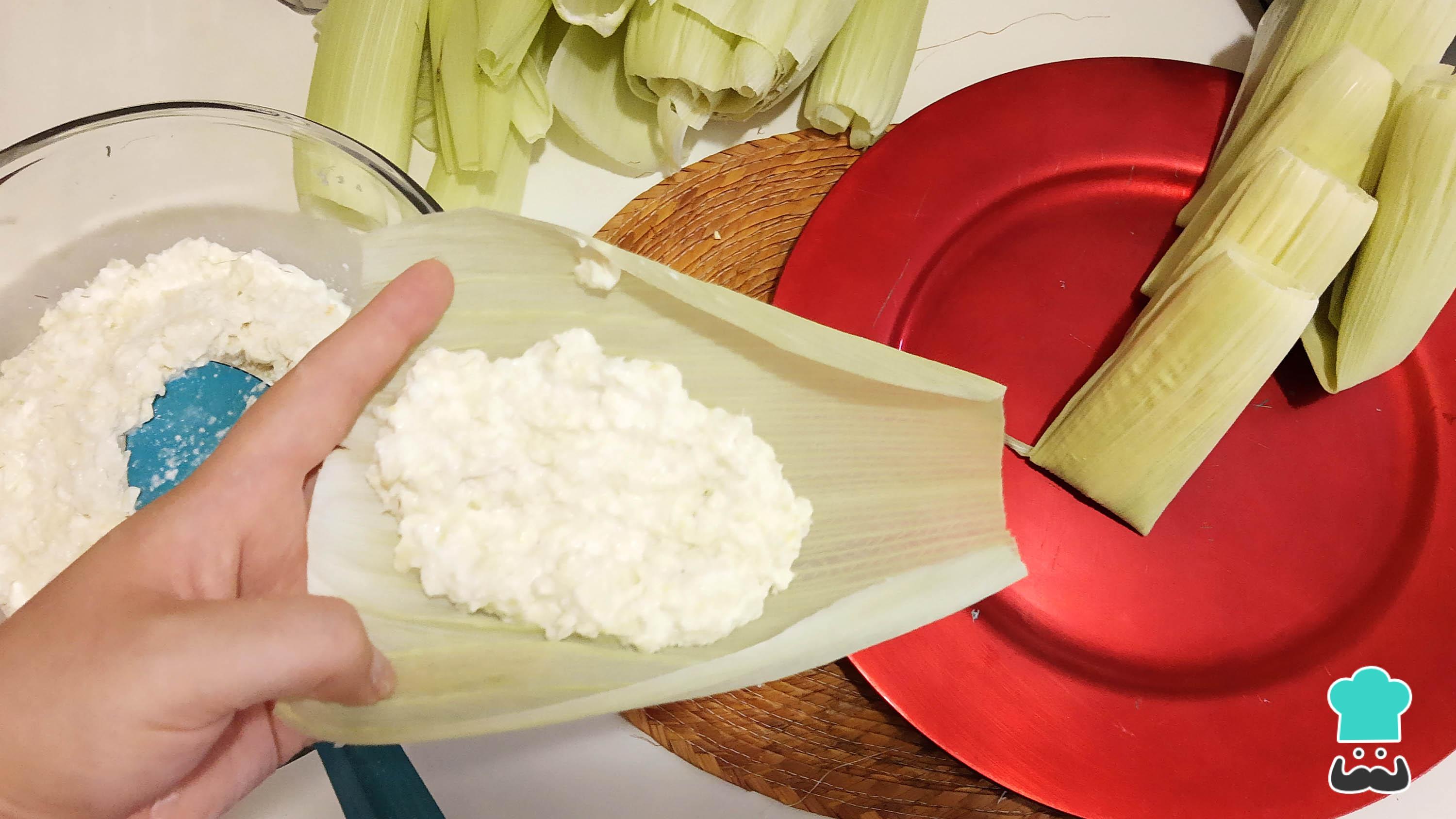 Comienza a formar los tamales de elote dulces tomando una de las hojas y añadiendo un poco de la masa molida. Esparce la masa un poco y cierra la hoja. Coloca los tamales de forma vertical para evitar que se abran.