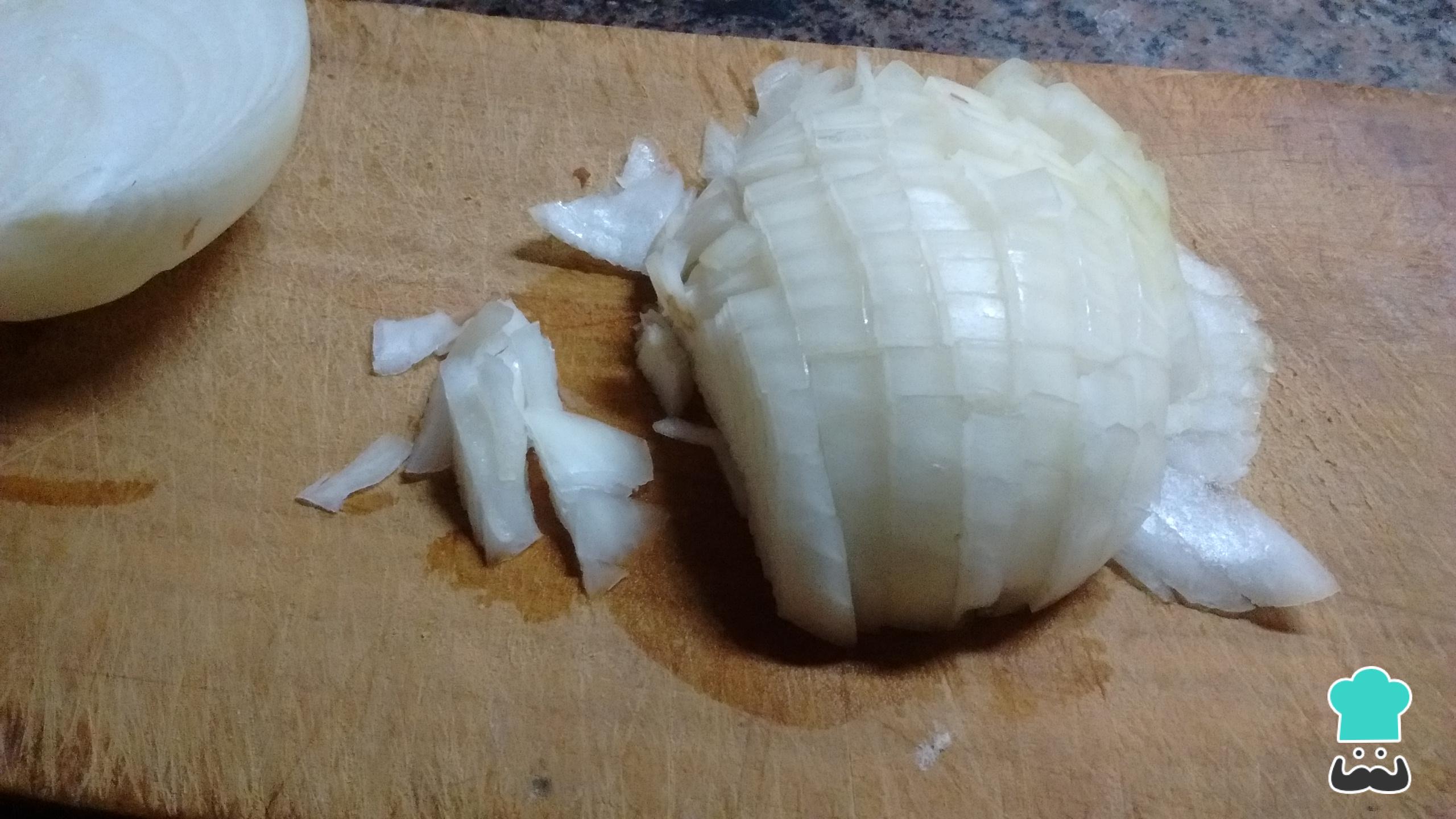 Para comenzar con la preparación de la tarta de acelga y ricota, pela y pica la cebolla.