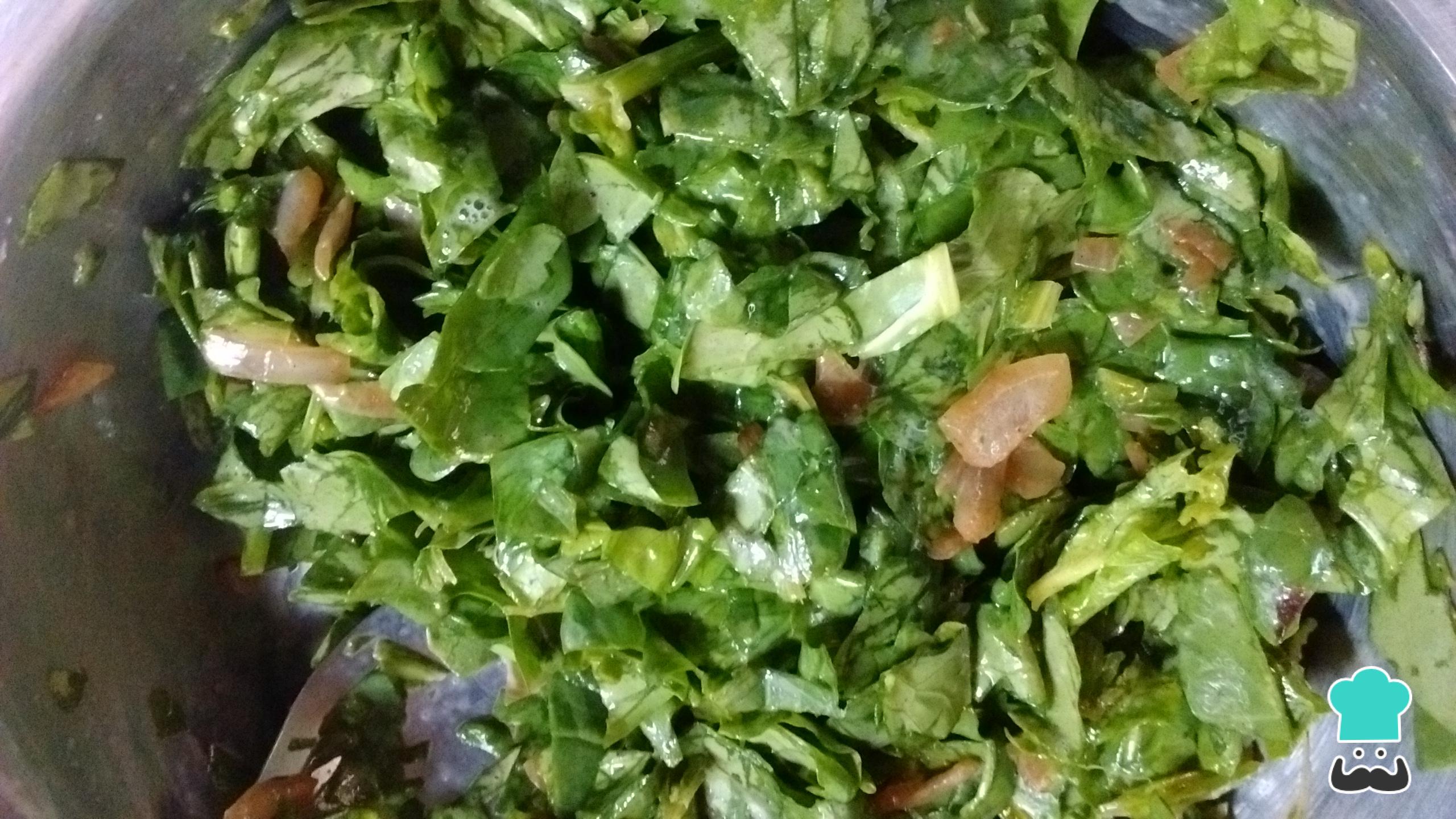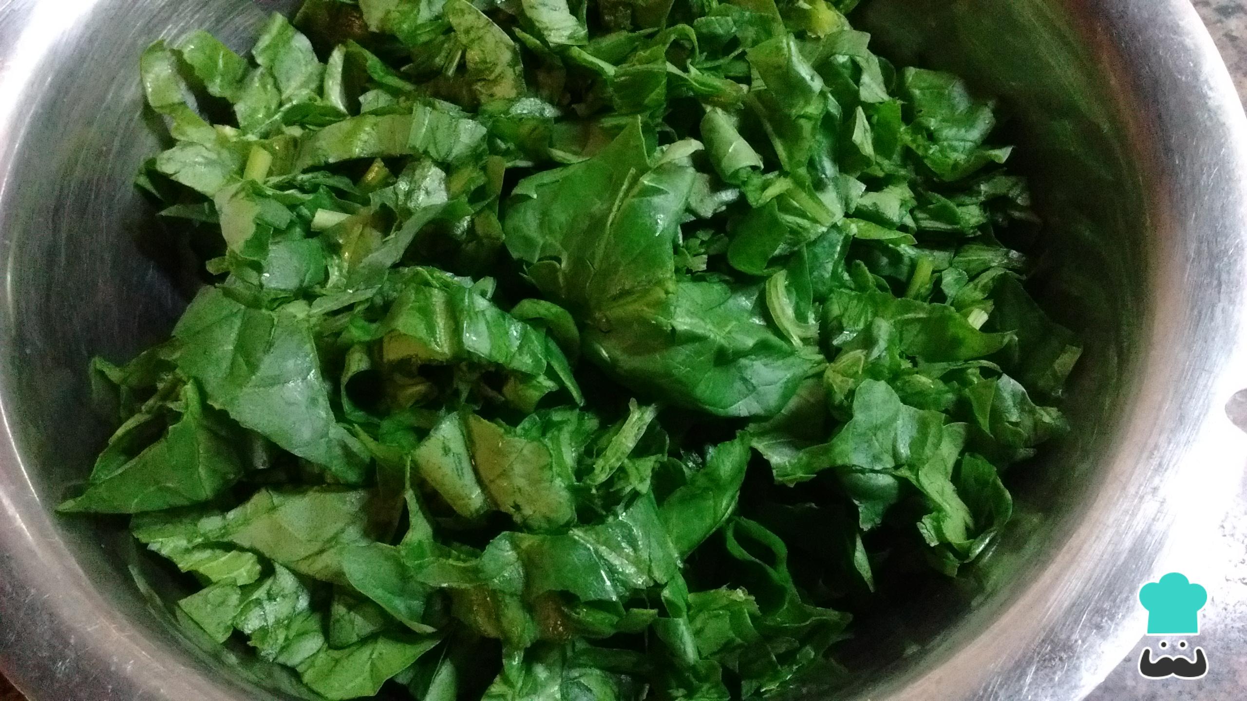 Lava perfectamente la acelga y separa las pencas. Pica la parte verde de la hoja y colócala en un recipiente.