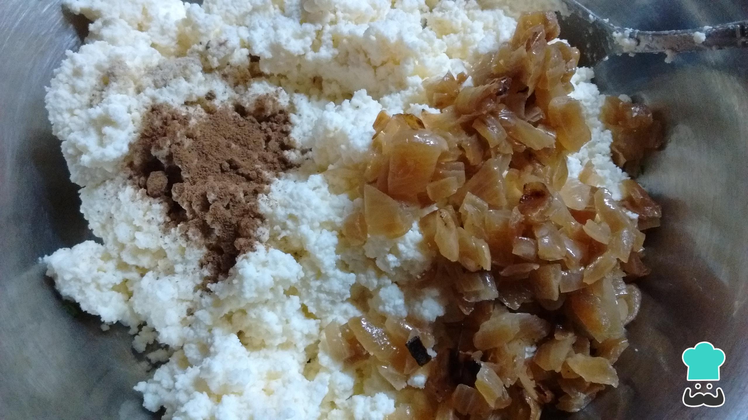 En otro recipiente mezcla la ricota junto con el otro huevo y la mitad de la cebolla. También condimenta con sal, pimienta y nuez moscada.