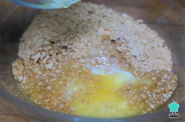 Para empezar con la torta de aguacate primero tritura las galletas con un robot, también puedes hacerlo a mano con un rodillo, añádelas en un bol. Seguido, ablanda la mantequilla unos segundos en el microondas y mezcla con las galletas. Señalamos que debe quedar bien mezclado los dos ingredientes. Por otra parte, las galletas deben quedar húmedas con la mantequilla.