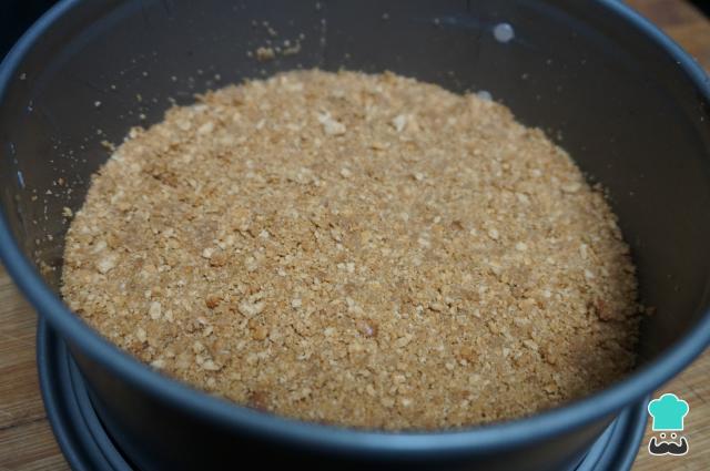 Coge un molde desmontable de 20 cm y cubre el fondo con las galletas, con una cuchara aplana bien para que quede una base consistente. Seguido, introduce el molde en la nevera y reserva.