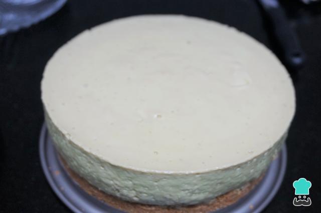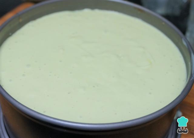 Retira el molde de la nevera, señalamos que debe estar un mínimo de 30 minutos, e incorpora toda la mezcla de la tarta. Seguido, alisa la superficie e introduce en la nevera, deja un mínimo de 3-4 horas o un día para que cuaje. Puedes probar la mezcla para ver si te gusta, debes saber que no queda una tarta muy dulce, sin embargo, puedes añadir más leche condensada o azúcar. ¡Ya casi está el pastel de aguacate!