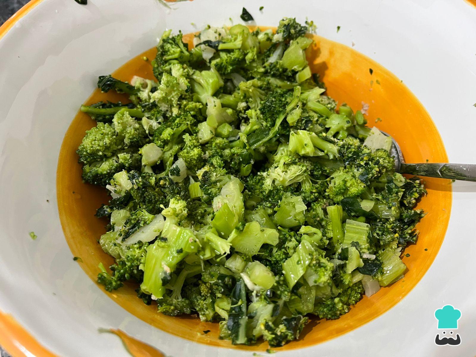 Cocina el brócoli. Para ello, separa cada arbolito y pela el tallo para cortarlo en cubos pequeños. Disponlo en un recipiente apto para microondas con los tallos hacia abajo y una cucharada de agua. Tápalo con papel film y cocínalo durante unos 3 minutos. Retira los abrolitos y cocina los tallos por unos 3 minutos más o hasta que estén tiernos. Pica todas las partes juntas.