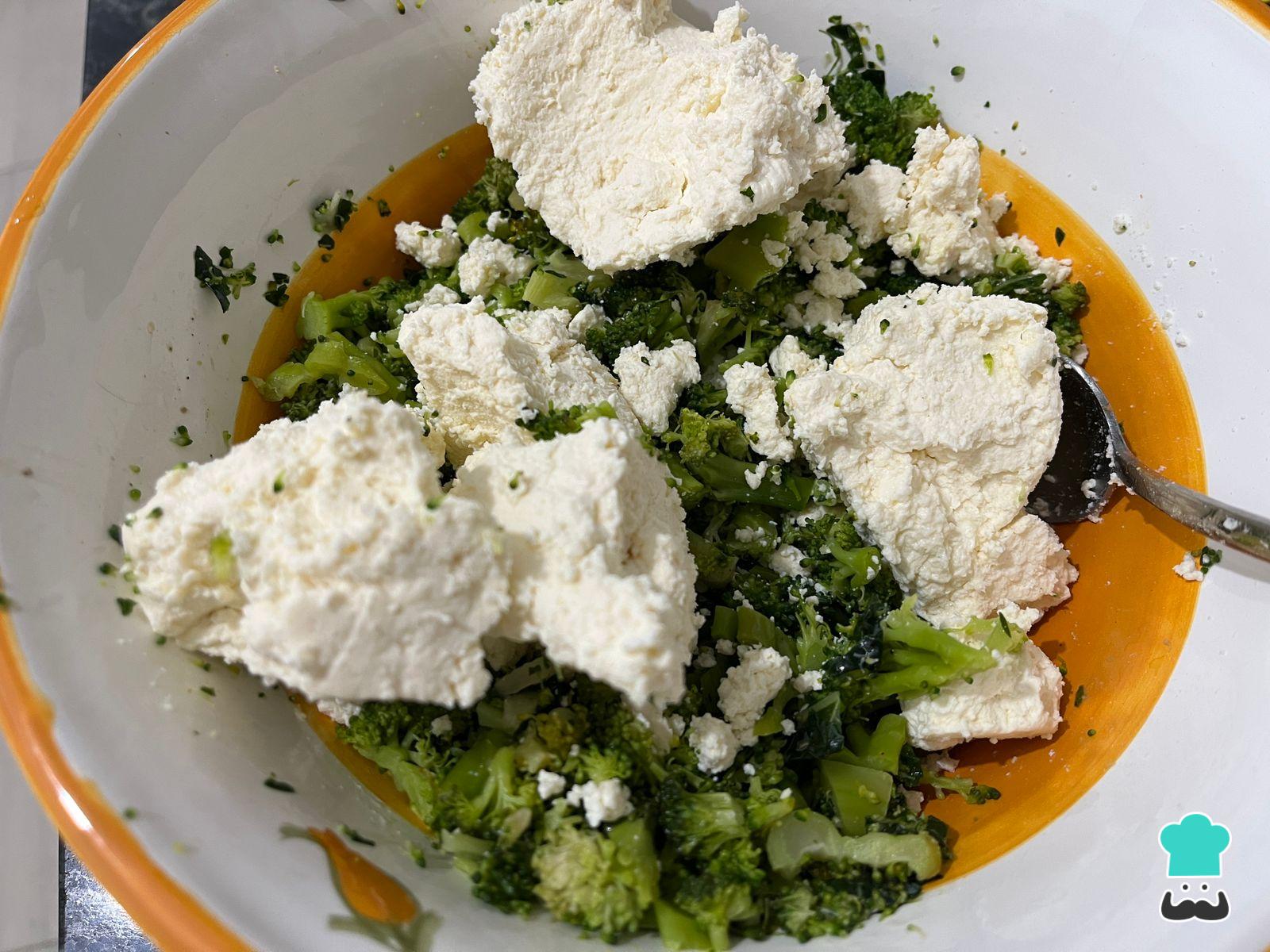 Mezcla el brócoli ya frío y picado con la ricota. Condimenta al gusto con nuez moscada, ajo y pimienta. Puedes elegir tus condimentos al gusto, así como la cantidad. Pruébalo y rectifica de ser necesario.