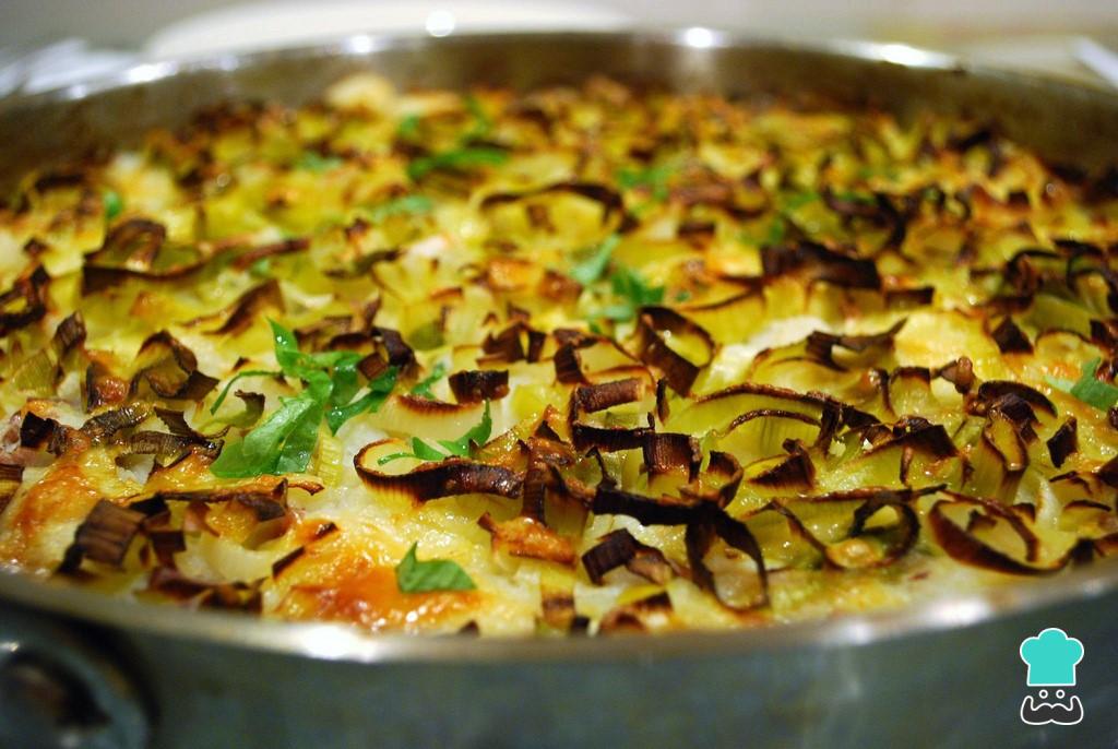 Vacía la mezcla en una fuente apta para horno y por encima, vierte la otra mezcla de puerro y cebolla. Cocinar al horno precalentado por 30-40 minutos a 200°C.