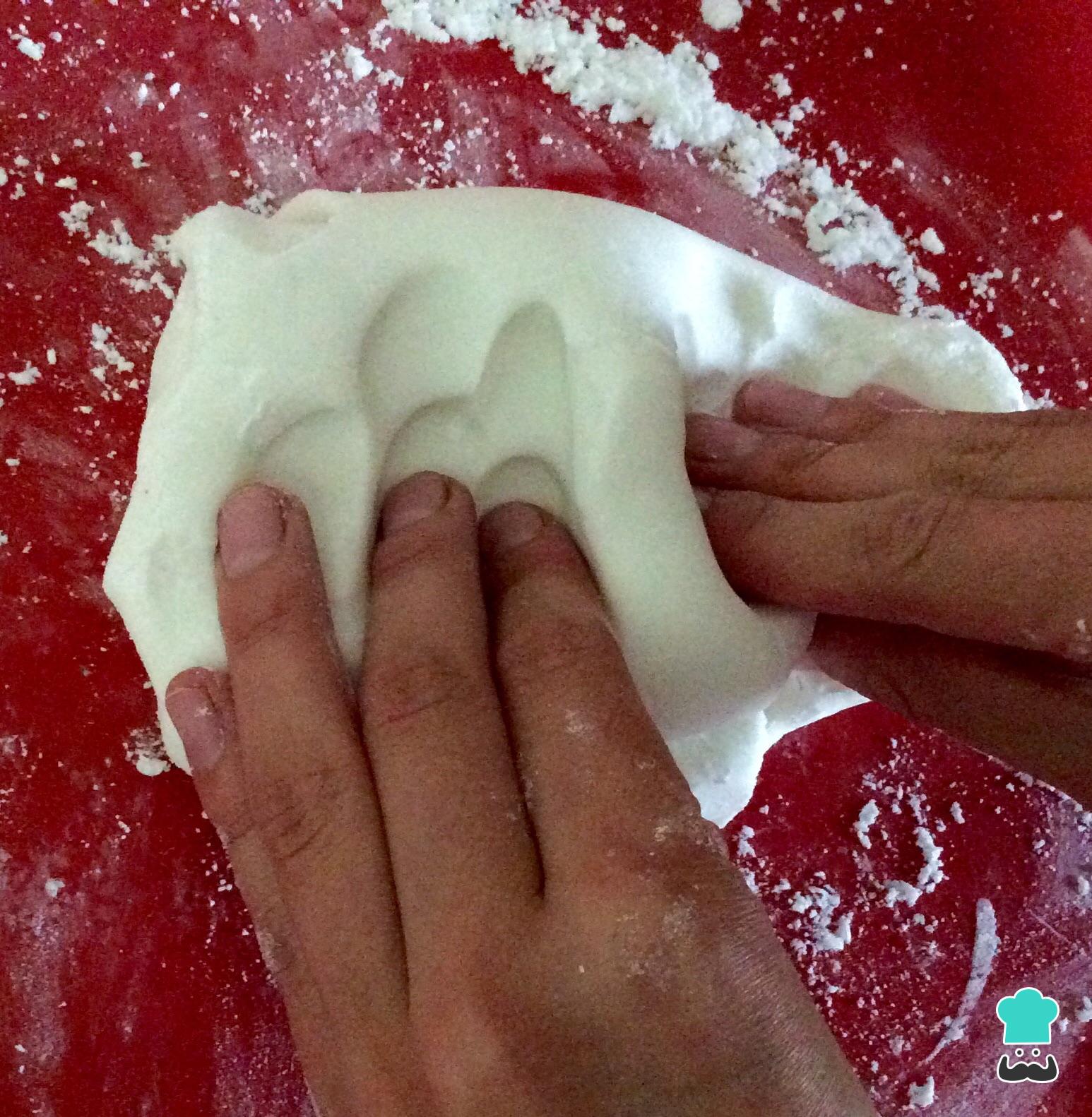 Para alistar el fondant lo primero que debes hacer es amasarlo durante 5 minutos esto estirando y recogiendo, o como amasando pizza! Para evitar que se pegue en las manos amasalo con azúcar impalpable.