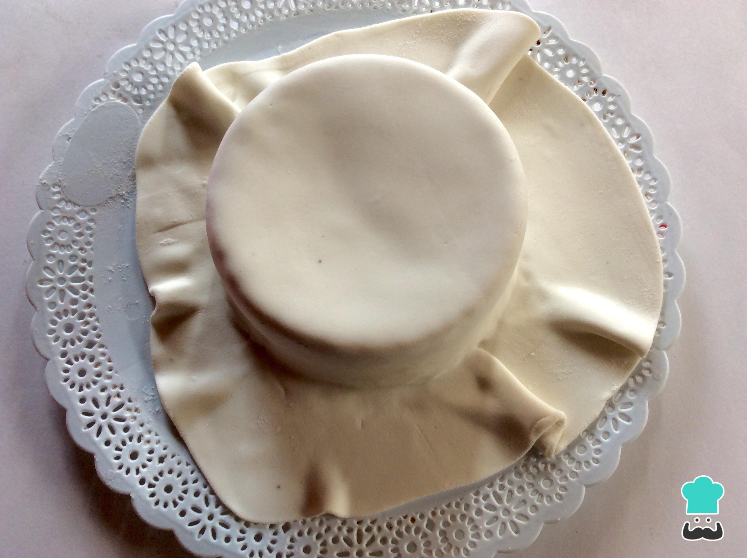 Cubre la torta colocando el fondant sobre ella y con tus manos asegurará frotando muy suavemente el fondant.