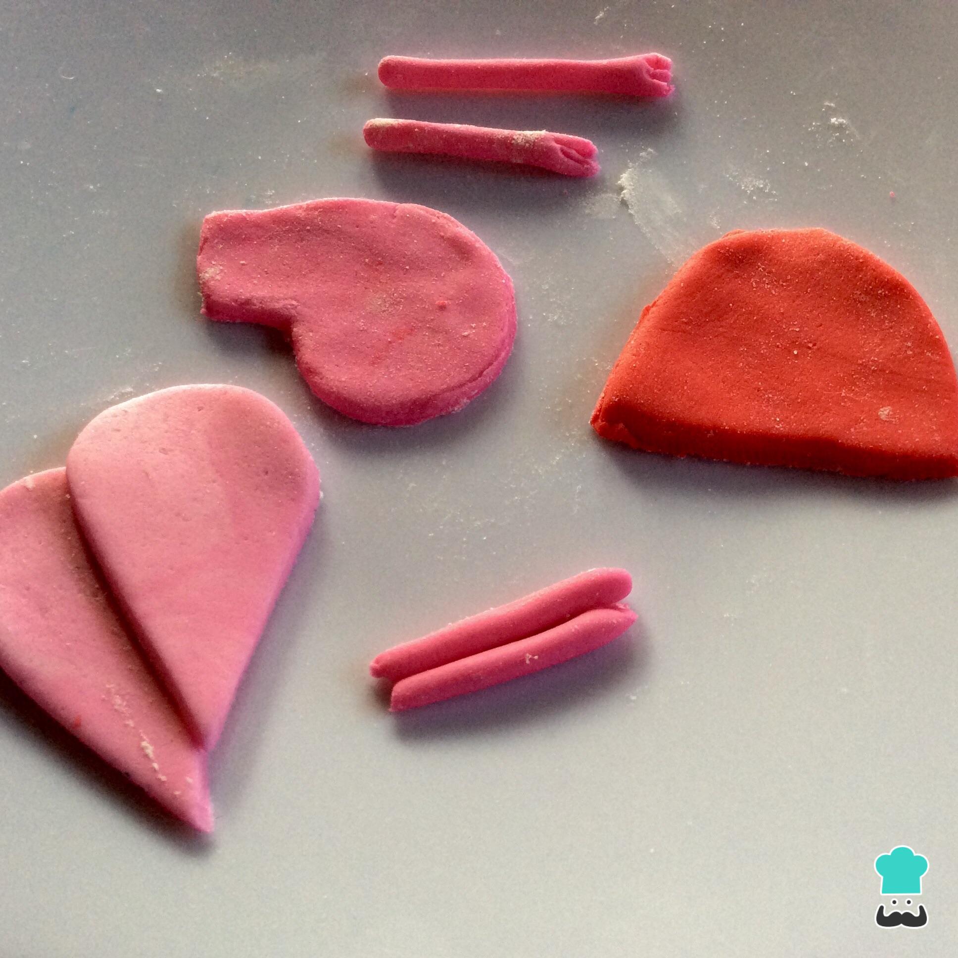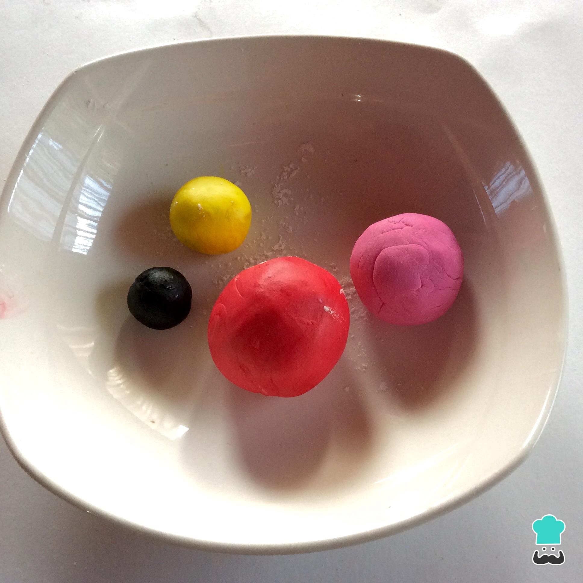Ahora vamos a pintar un poco de fondant para hacer nuestra Peppa pig esto lo haces colando una gota de colorante en un pedazo de fondant si quieres que el color quede mas oscuro solo agrega mas colorante, no olvides colocar en tus manos azúcar impalpable para que no se pegue el colorante, amasa el fondant pintado para que el color lo pinte todo. Pinta los colores que ves en la imagen .