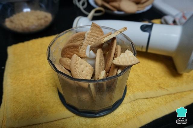 El primer paso para hacer nuestra tarta de chocolate con galletas será triturar las galletas María hasta que queden en polvo, o en trozos muy pequeños.