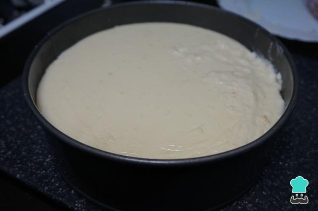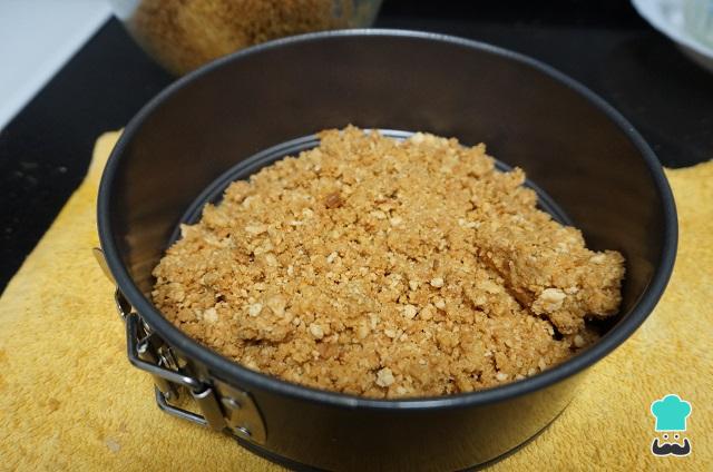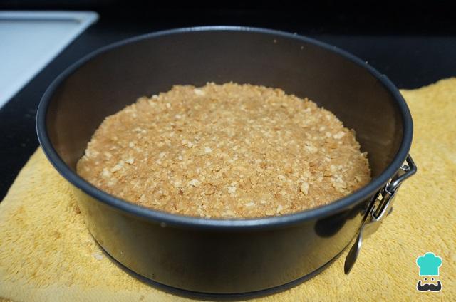 Extendemos esta masa en la base de un molde desmontable de unos 22 centímetros de diámetro. Procura cubrir bien el fondo y la capa de galletas sea un poco gruesa.