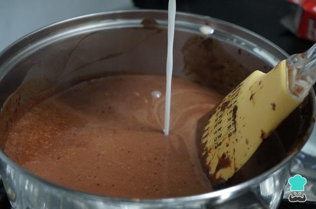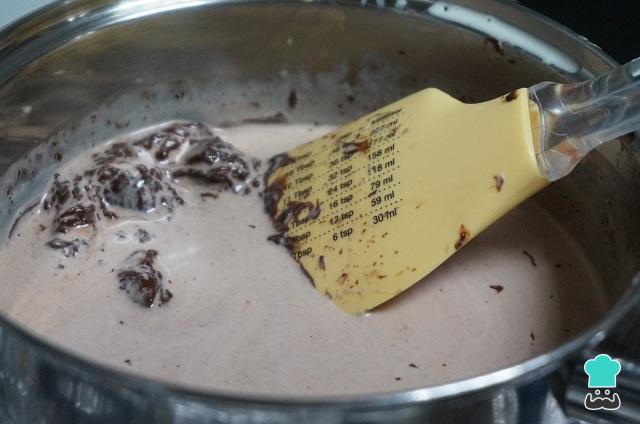 Continuamos removiendo de forma constante para que la mezcla de chocolate no se pegue. Cuando empiece a espesar lo retiramos del fuego, no hay que dejarlo hervir.