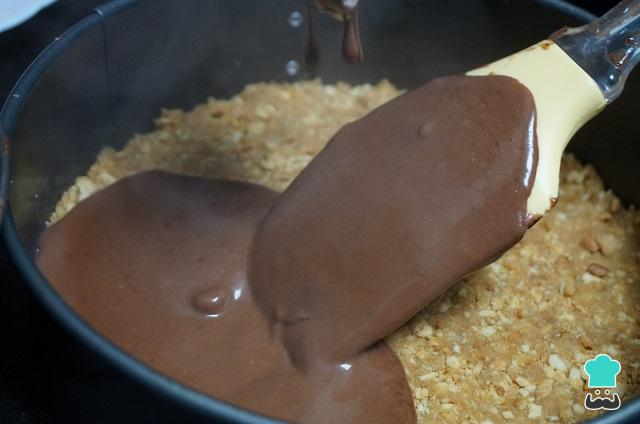 A continuación vertemos la mezcla de chocolate sobre la base de galletas, ayudándonos con una cuchara de repostería para ir poco a poco y cubrir la base de forma uniforme.