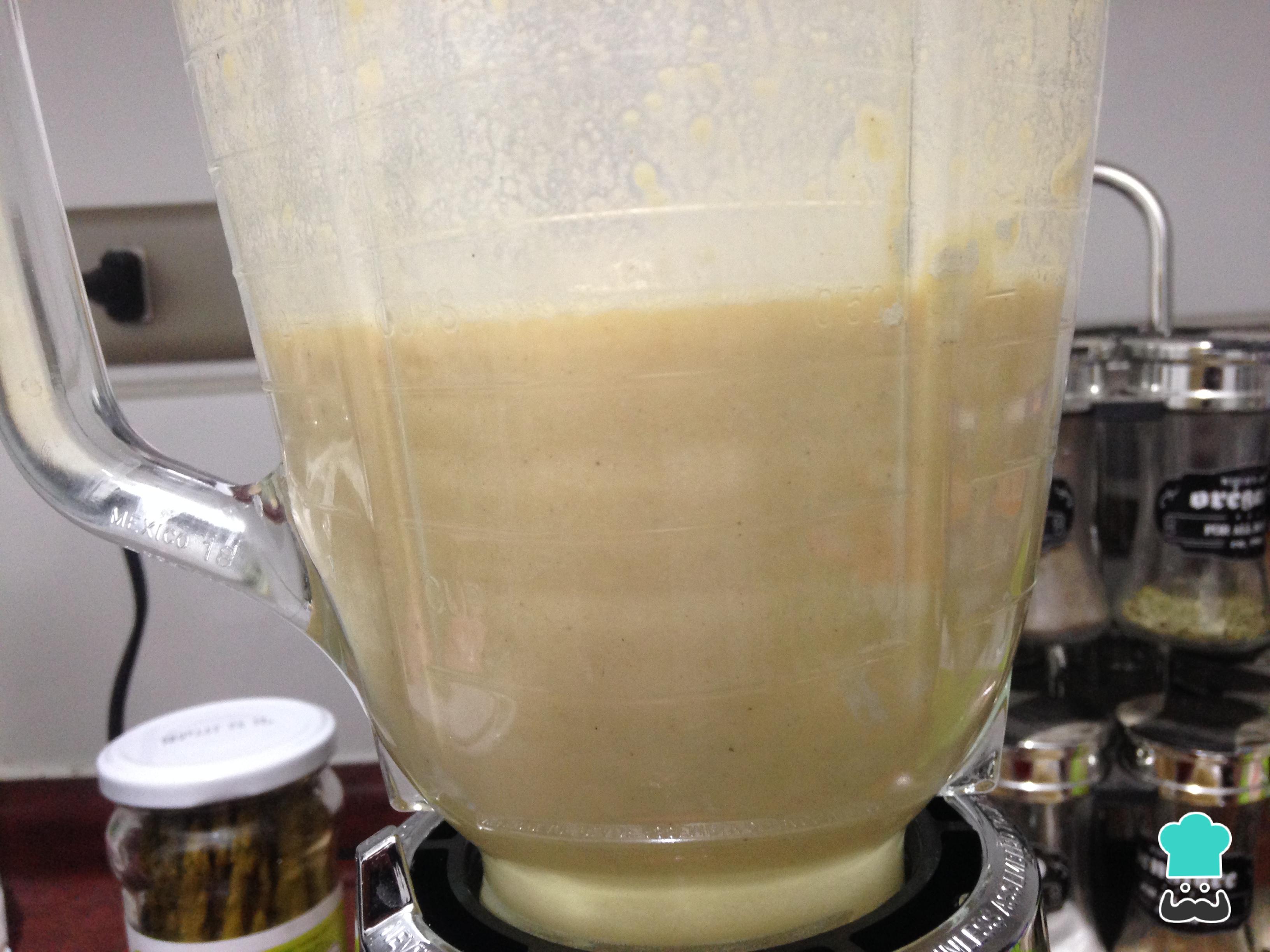 Procesa los huevos, los quesos, el ajo, la harina y el chorro de nata en la licuadora o procesadora hasta que quede una mezcla con textura parecida a la de los pancakes.