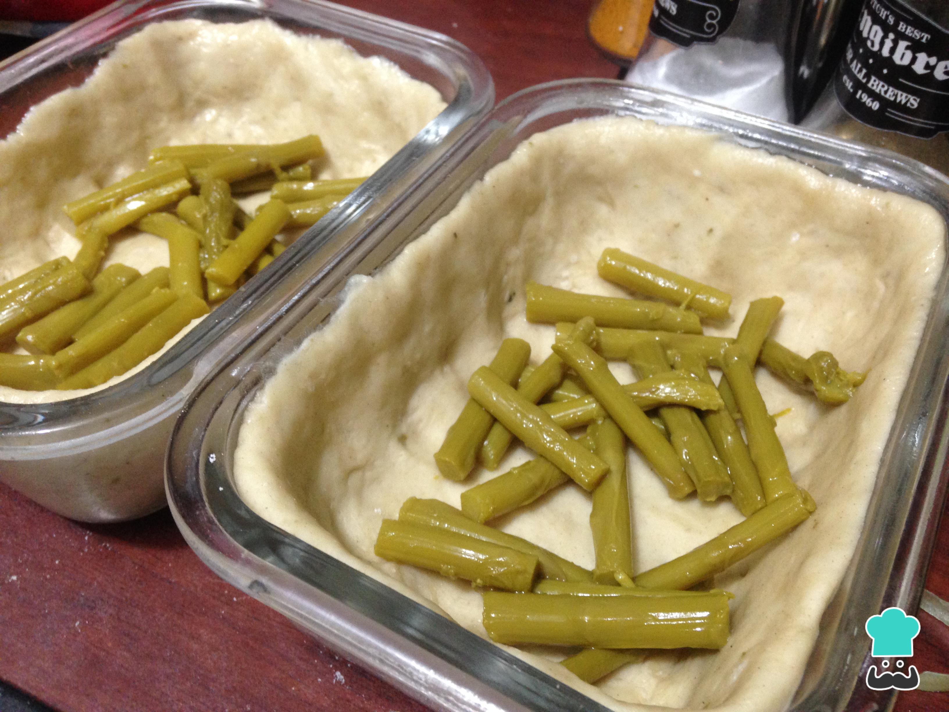 Coloca unos cuantos trozos de espárragos encima de la masa que tenías reservada y presiona levemente para que se queden fijos en el fondo.