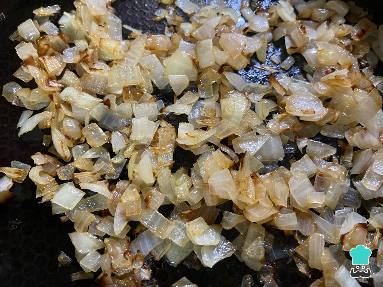 Pela y pica la cebolla y rehoga en una sartén con una cucharada de aceite.